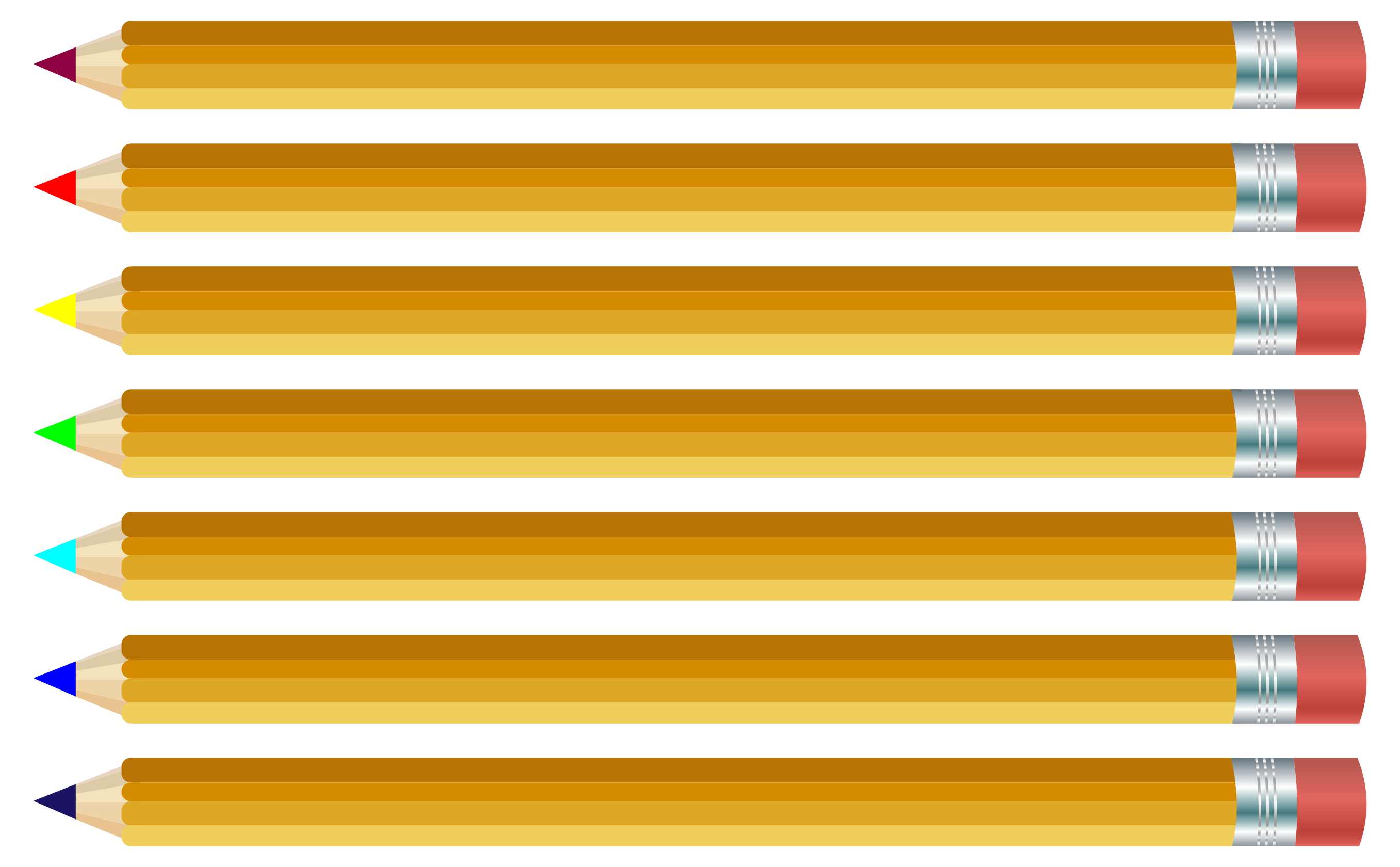 This features a row of seven different colored pencils, each with an eraser on the end. These pencils are arranged in a neat line and vary in color from yellow to red. They appear to be made of wood and have a classic design, making them suitable for various artistic or educational purposes. The arrangement of these pencils creates an appealing visual display that showcases their variety and attractiveness.