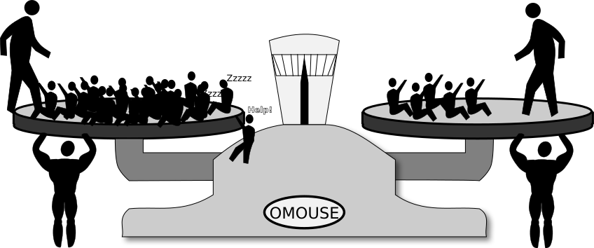 This features a group of people standing on two platforms, with some of them holding up signs. There are at least 14 individuals visible in the scene, each engaged in various activities. One person is sitting down while others stand or walk around. A man appears to be holding a sign that says "OMouse," which could indicate an event or gathering related to this name. The people on both platforms seem to be interacting with one another and possibly discussing the topic at hand.