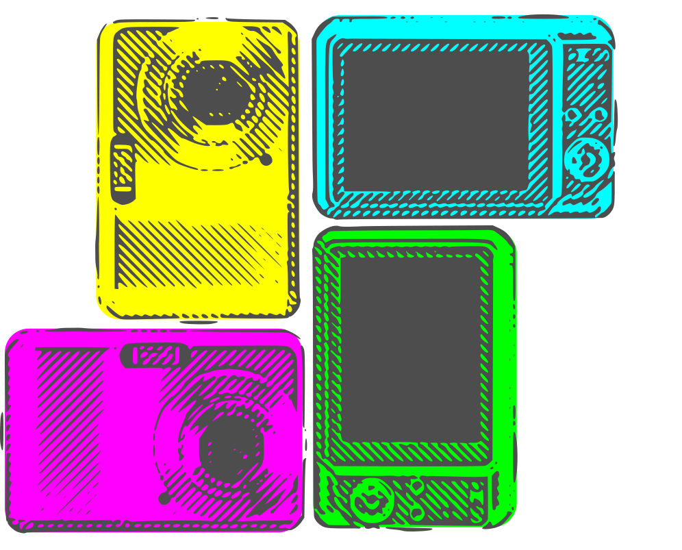 This features four different colored cameras, each with a unique hue. They are all placed on top of one another, creating an interesting visual effect. Two of the cameras are positioned in front, while the other two are shown from behind. This arrangement showcases the variety and diversity of these colorful devices. The image is reminiscent of a vintage photo or a retro-style advertisement for camera products.