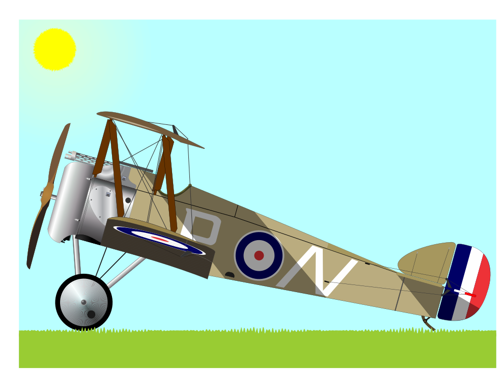 This features a small airplane with propellers, sitting on the grass. It is an old-fashioned plane with a vintage design and has a yellow sun above it. The plane appears to be parked in a field, possibly for display or as part of an outdoor exhibition. Its presence adds a sense of nostalgia and charm to the scene.