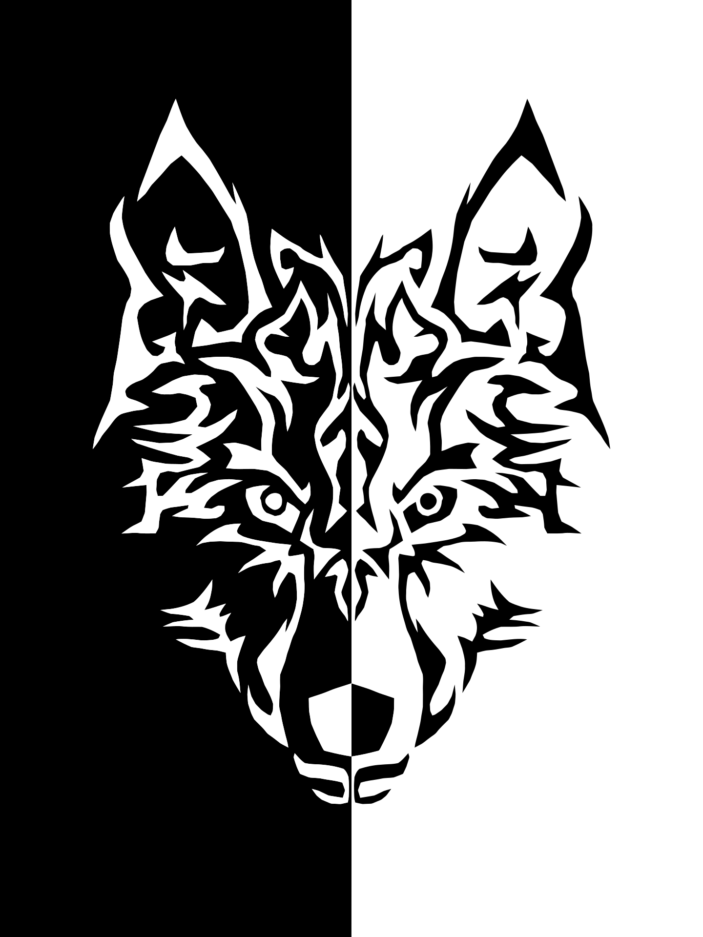 This features a wolf's head, which is the main focus of the picture. It is an illustration that has been split in half, with one side being black and the other white. This creates a striking contrast between the two colors, making the wolf's head stand out even more. The wolf's head is positioned in the middle of the image, drawing attention to its features.