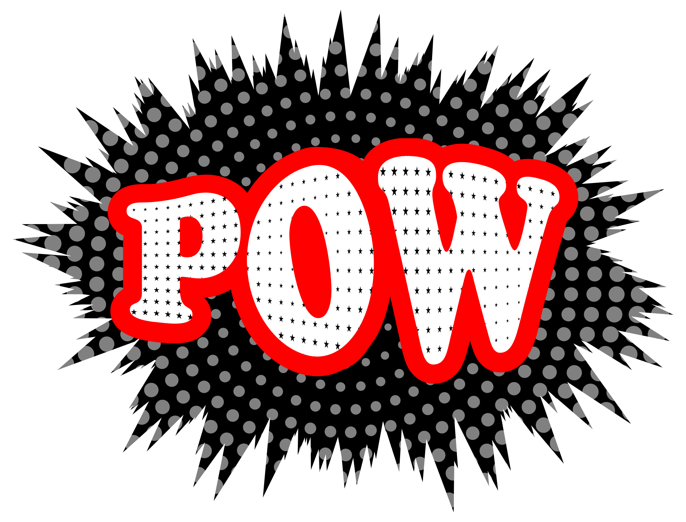 This features a red and black sign with the word "POW" written in white. The letters are outlined in red, giving them a bold appearance. Behind the sign, there is an explosion-like background that adds to the overall visual effect of the sign. This design could be used for various purposes such as advertising or promoting a product or service related to comic books or superheroes. The combination of red and black colors with the white text creates a striking contrast, making it an eye-catching design that is sure to grab attention.