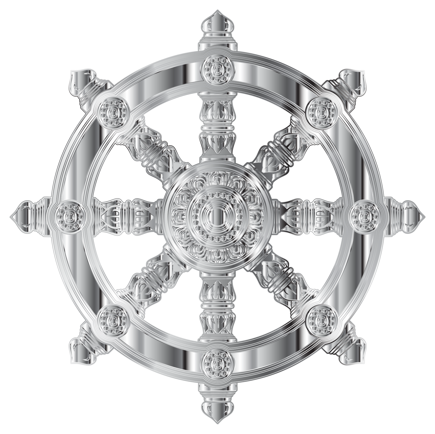 This features a large, intricately designed silver wheel with multiple spokes. It appears to be an ornate piece of art or decoration, possibly inspired by Buddhist symbolism. The wheel is adorned with numerous jewels and gemstones, adding to its visual appeal. The combination of the silver material and the sparkling gems creates a striking contrast against the white background, making it stand out as an eye-catching centerpiece or decorative piece.
