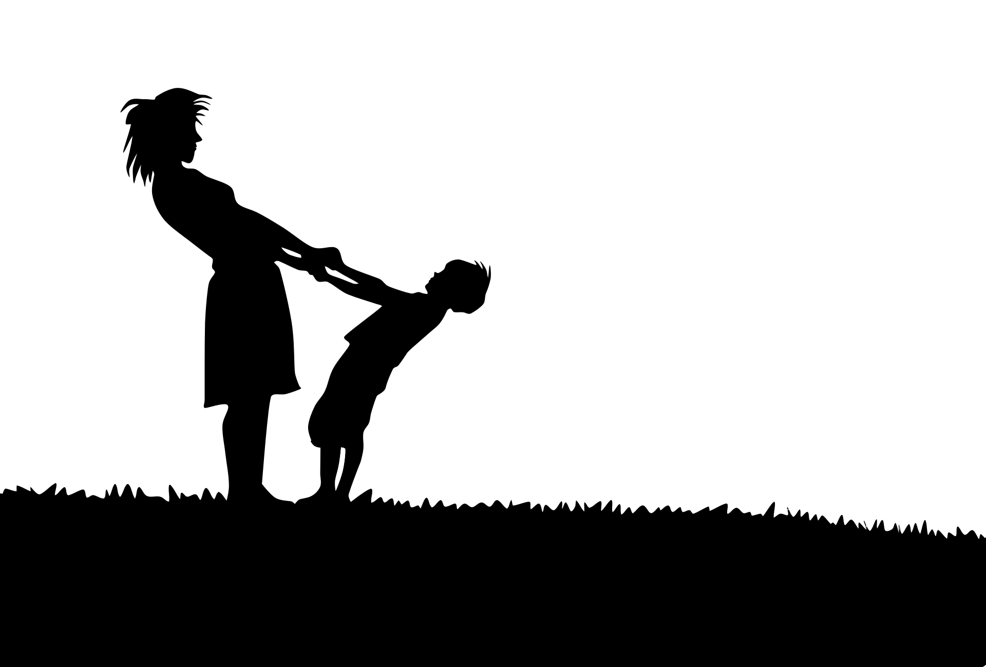 This features a woman and a child standing on a grassy field. They are both silhouetted against the sky, creating an artistic black and white scene. The woman is holding onto the little boy, who appears to be climbing up her leg or being lifted into the air. This creates a sense of playfulness and bonding between the two individuals. The overall atmosphere of the image evokes feelings of warmth and connection, as it captures a tender moment shared by the woman and child in an open outdoor space.