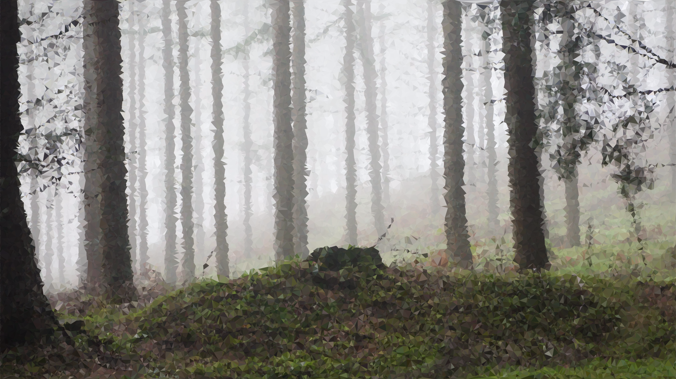 This depicts a foggy forest with many trees. The trees are tall and appear to be covered in moss, giving the scene an eerie atmosphere. There is a large rock located near the center of the forest, surrounded by trees on all sides. The fog seems to be rolling through the area, creating a sense of mystery as it envelops the landscape.