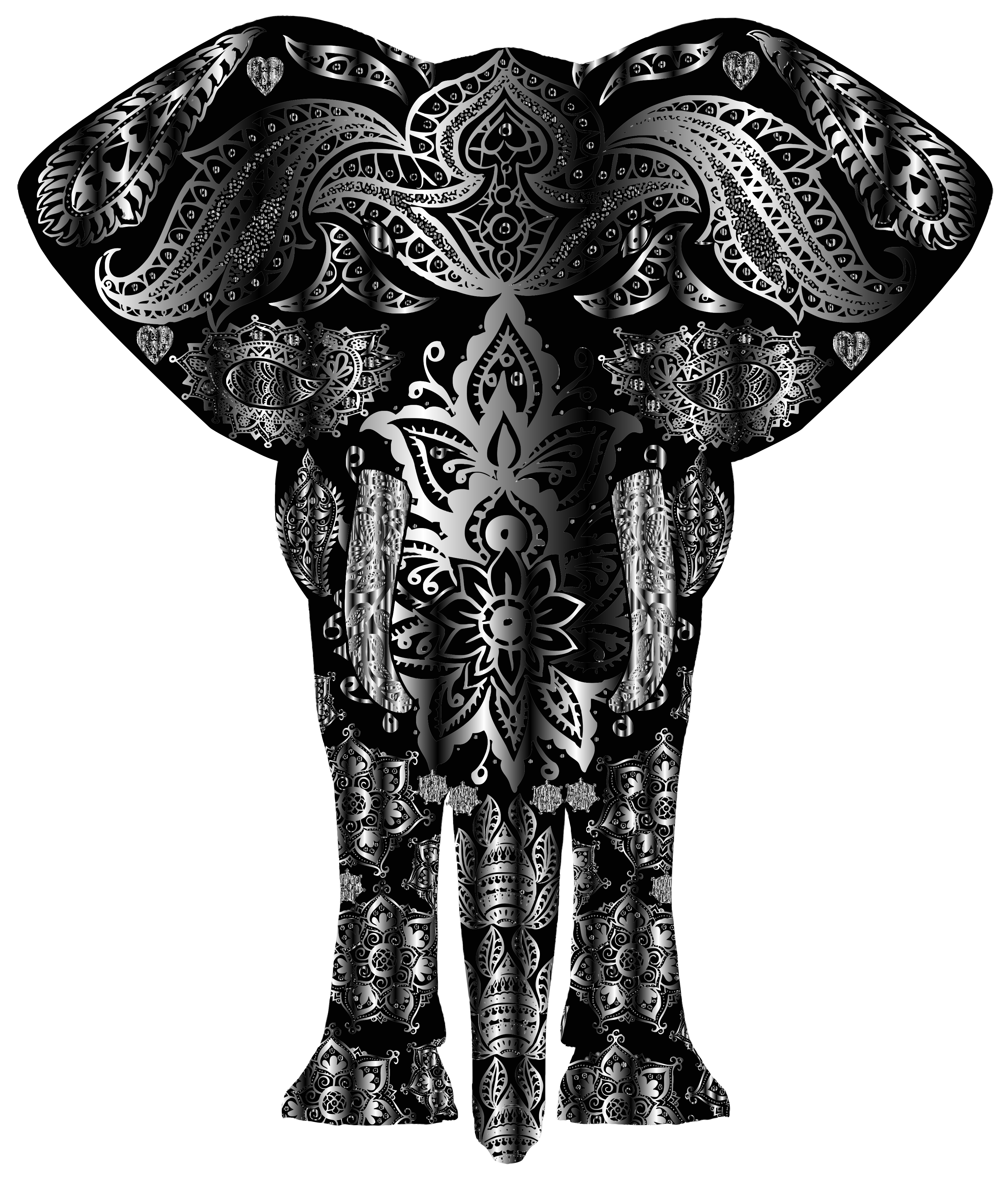 This features a large, intricately designed elephant with its trunk raised. The elephant is adorned with an ornate pattern that covers most of its body, giving it a unique and eye-catching appearance. The design on the elephant's skin resembles a sun, adding to the overall visual appeal of the image. The black and white color scheme of the elephant further accentuates the intricate details in the pattern.