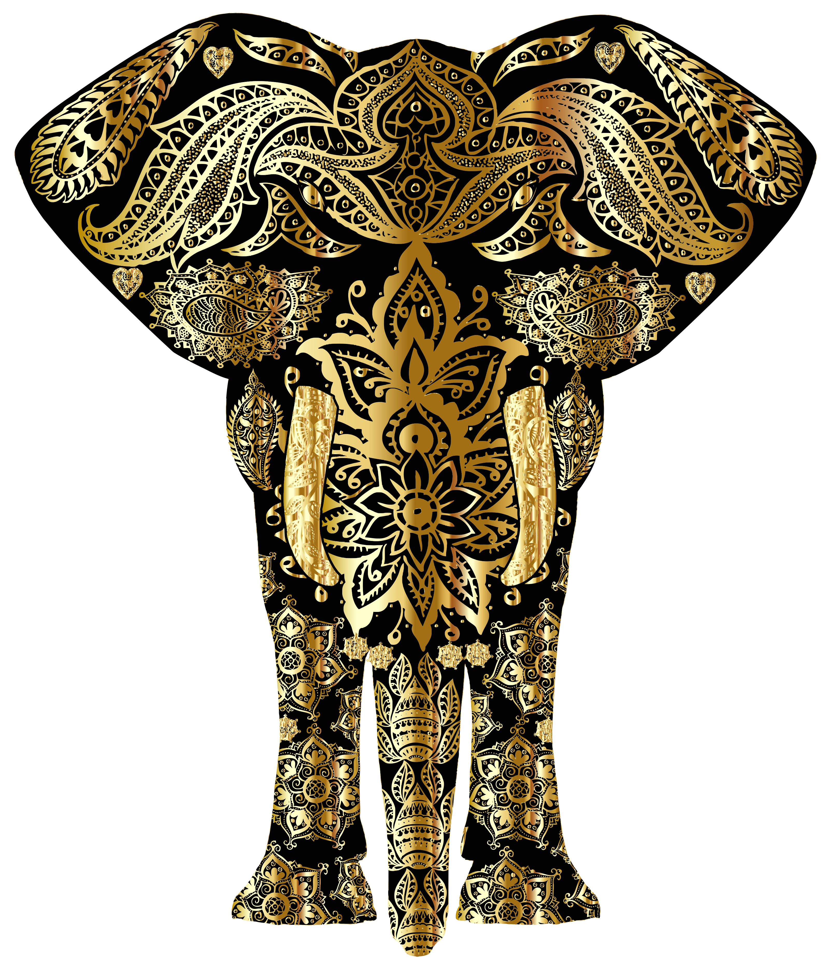 This features a beautifully decorated elephant with intricate designs on its body. The elephant is adorned with gold and black patterns, giving it an elegant appearance. It has two large tusks that are prominently displayed, adding to the majestic look of the animal. The design on the elephant's trunk is particularly eye-catching, making it a focal point in the image. Overall, this artistic representation of an elephant showcases its beauty and grace with its intricate patterns and decorations.