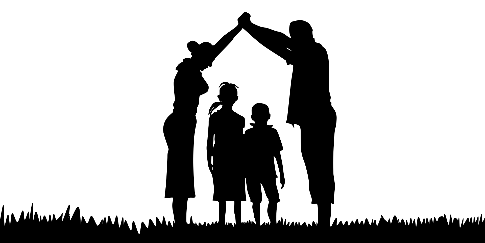 This features a family of four, consisting of two adults and two children. They are standing together in the grass, with their arms raised above them as if they are holding hands. This creates an impression of unity and togetherness among the family members. The scene is set against a backdrop of a house, which further emphasizes the sense of home and family life.