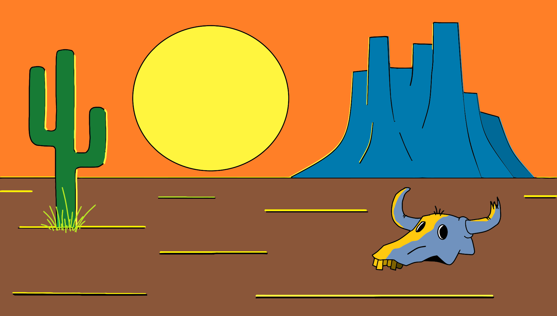 This features a cactus in the foreground, with a sun setting behind it. In the background, there are two large mountains, one on the left and another on the right side of the scene. A bull is also present in the middle of the scene, adding an interesting element to the composition. The overall atmosphere suggests a desert landscape during sunset, creating a serene and picturesque setting.