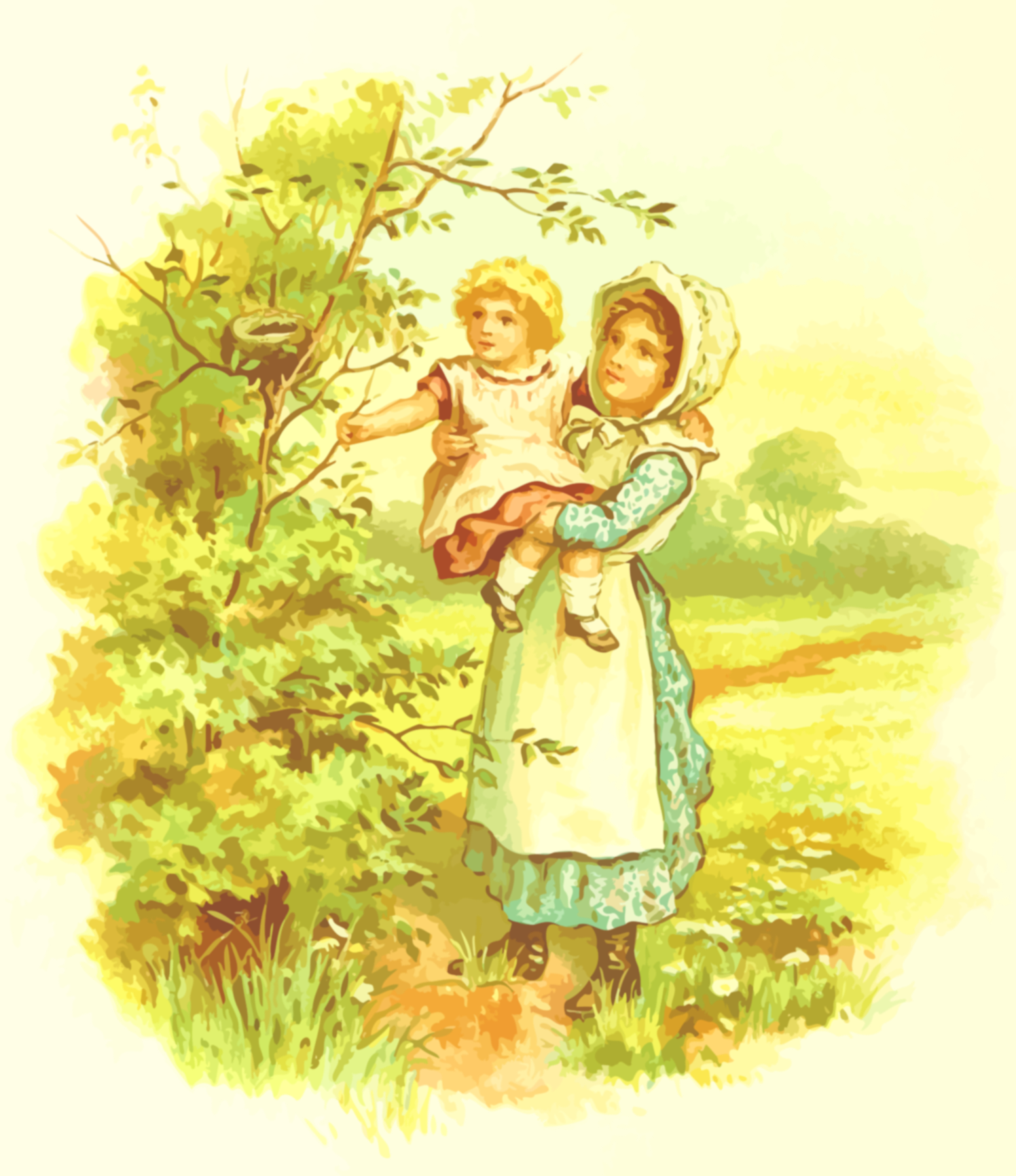 This features a woman dressed in a blue dress, holding a young child in her arms. They are standing outside in the garden, surrounded by trees and greenery. The woman appears to be wearing an apron, which suggests that she might have been engaged in some outdoor activity or chores before taking time to hold her child. The scene captures a tender moment between the mother and her child, as they enjoy each other's company amidst nature.
