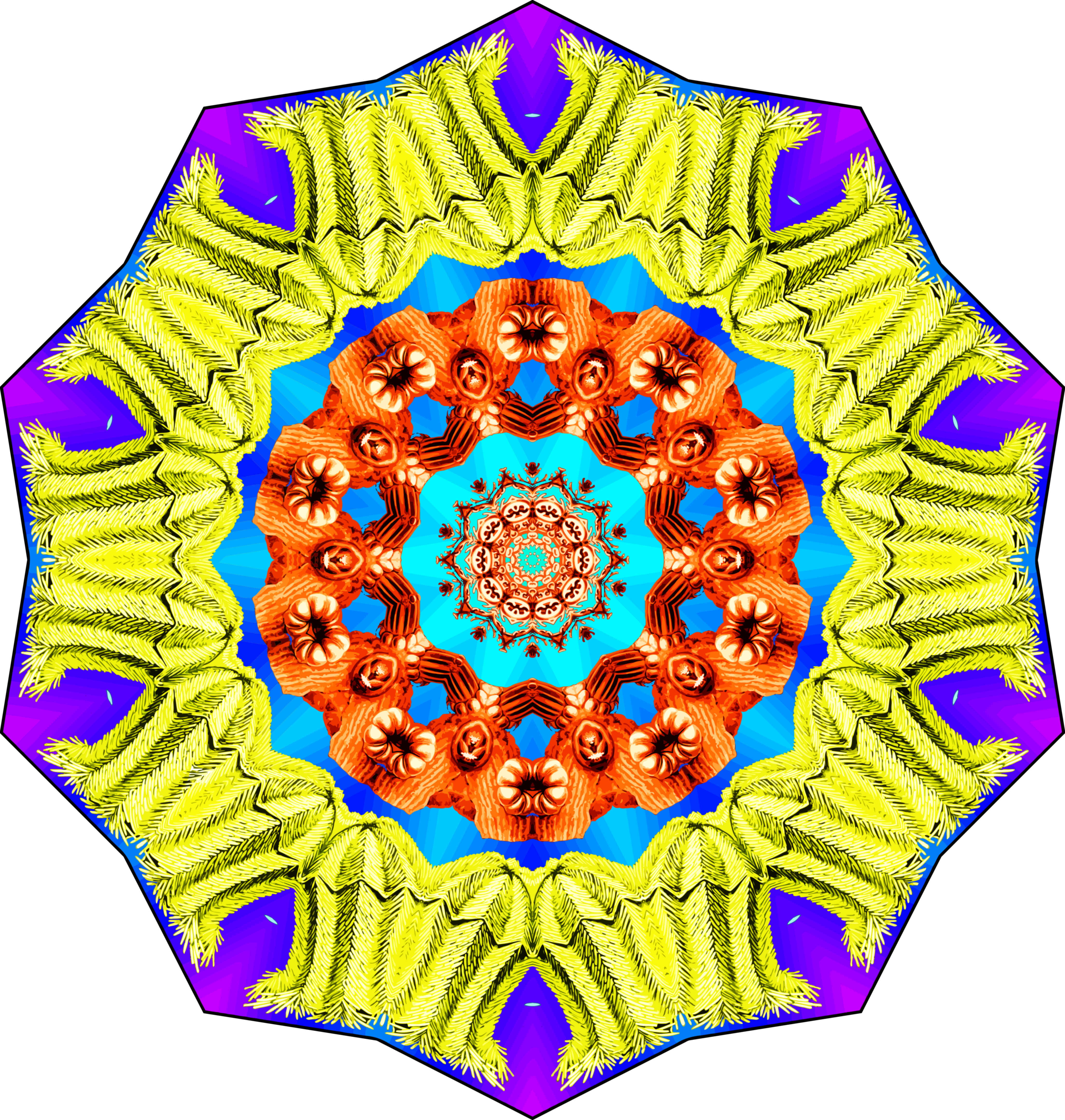 This features a colorful, circular design with an intricate pattern of orange and blue colors. The center of the circle is adorned with a beautifully detailed flower, adding to the overall visual appeal of the piece. This artistic creation appears to be inspired by Ernst Haeckel's wildlife drawings, as it showcases a similar level of detail and complexity in its design. The image was created using Paint.net, where the artist utilized wedges of the drawing to rotate around a central point, resulting in an eye-catching pattern that captures attention.