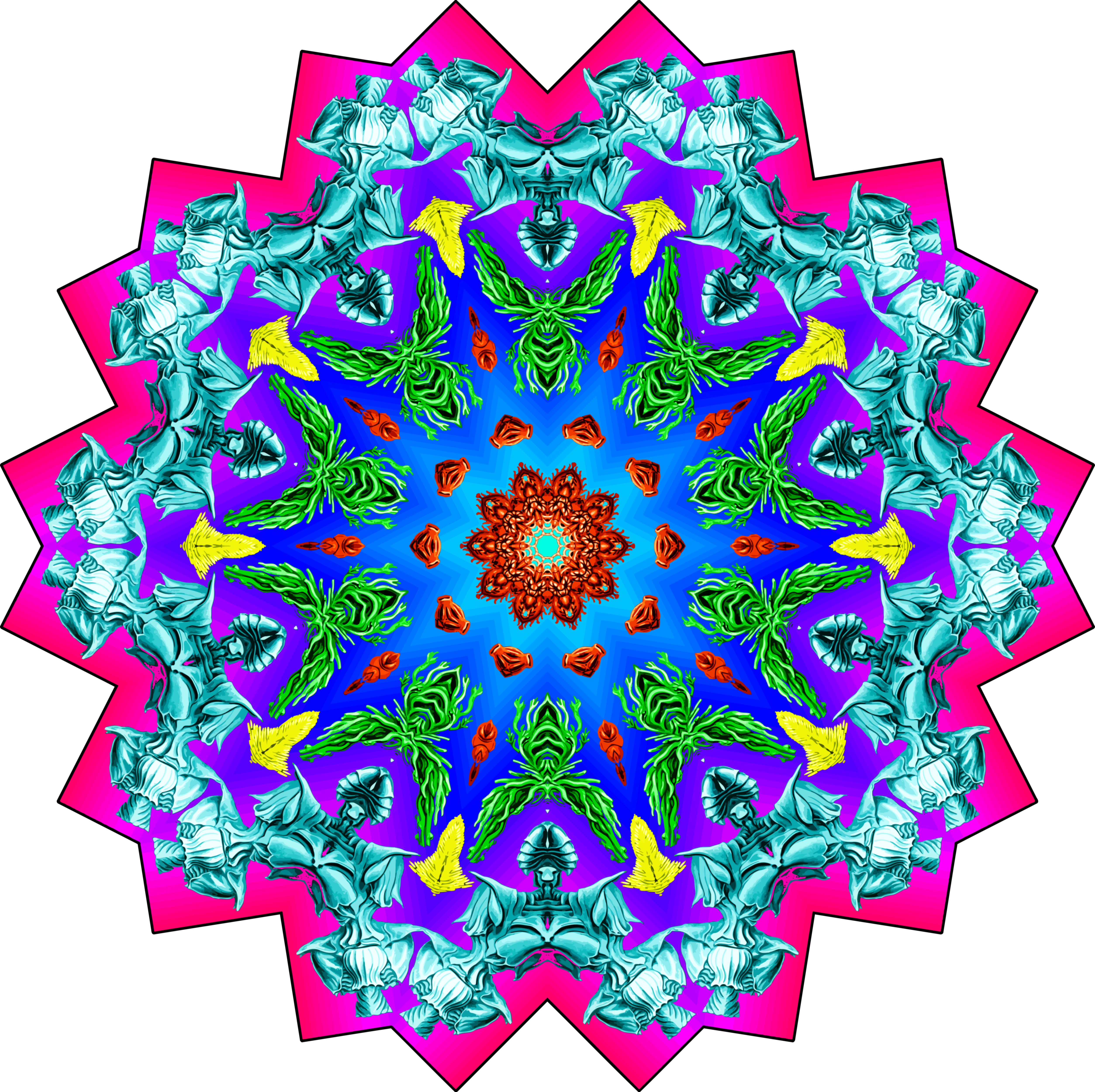 This features a large, colorful, and intricate design that resembles an eye or a flower. It is composed of many small circles arranged in a circular pattern, each containing different colors and shapes. The overall effect creates a vibrant and captivating visual experience. This artwork appears to be inspired by the work of Ernst Haeckel, who was known for his detailed illustrations of marine life. The artist has added their own unique touch to this design, making it stand out as an impressive piece of art.