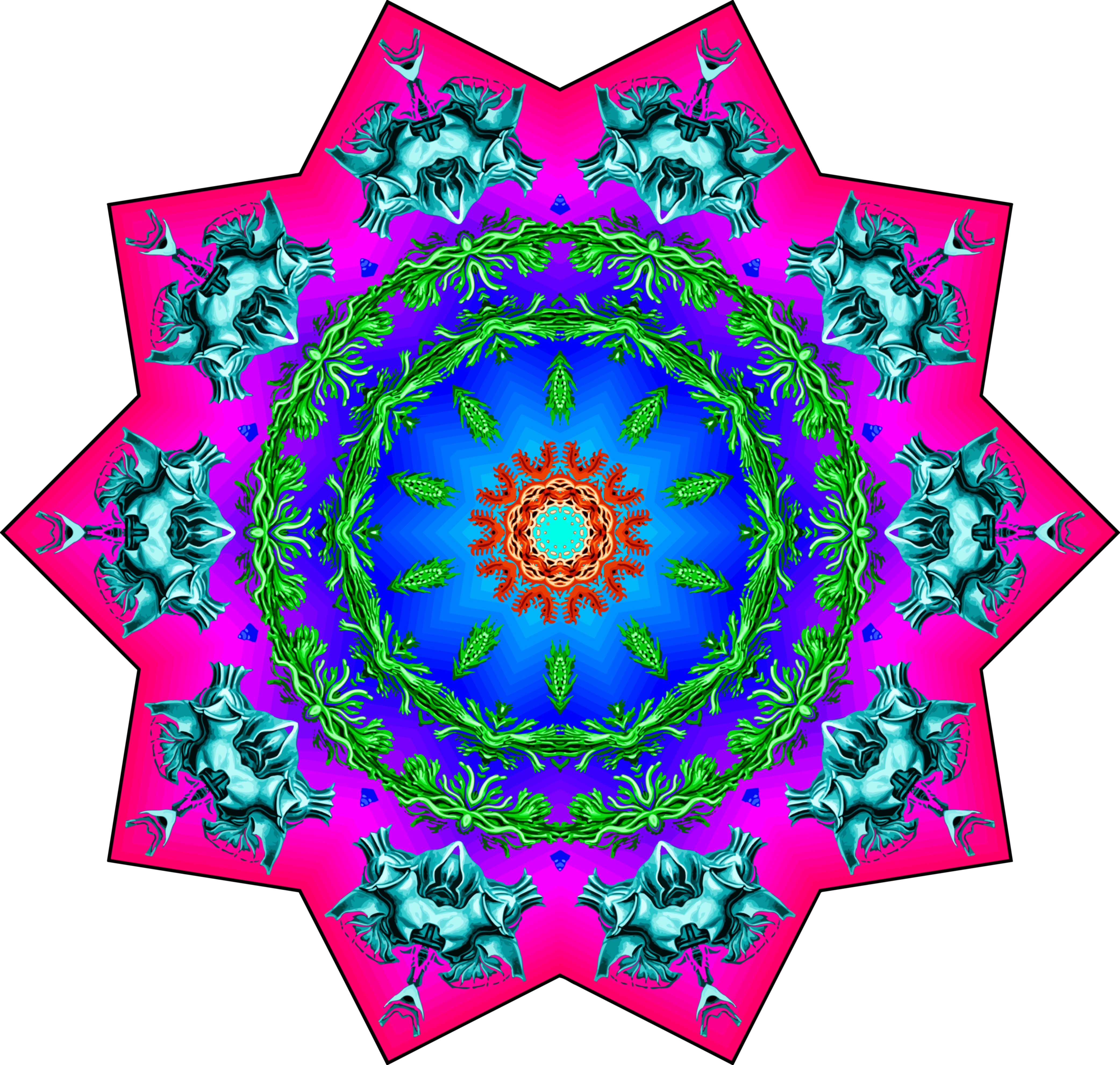 This features a large, colorful, and intricate design that resembles an eye or a flower. This artistic piece is composed of various shapes and colors, creating a visually striking pattern. The design appears to be inspired by Ernst Haeckel's wildlife drawings, with added vibrant colors that make it stand out even more. The intricate details in the design suggest that it was created using a software program like Paint.net, where the artist used repeated rotation of wedges around a central point to form the final pattern. This unique and captivating artwork showcases the creativity and skill involved in its creation.