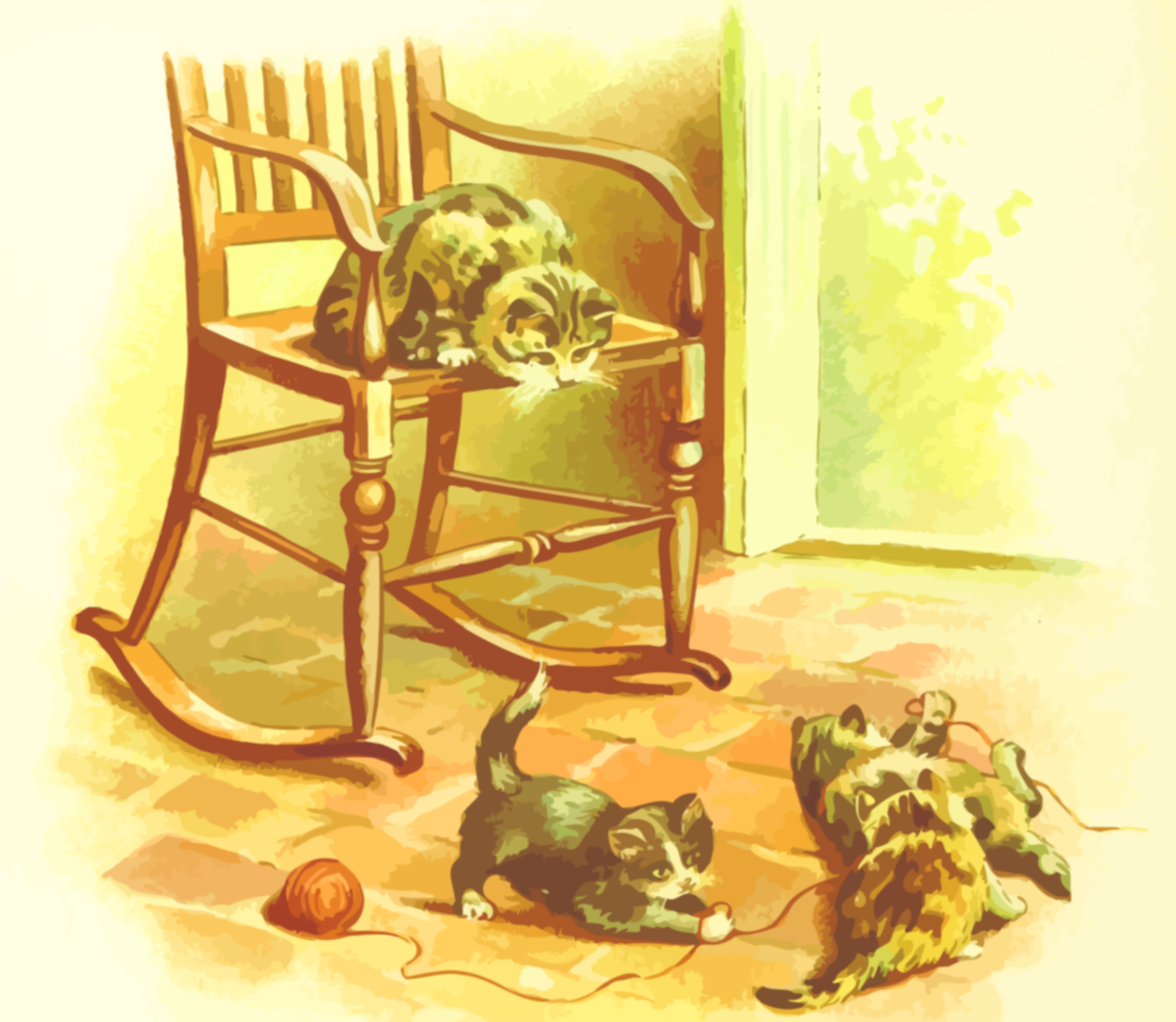 This features a cozy scene of four cats playing together in a room. One cat is sitting on top of a wooden chair, while the other three are on the floor, engaging with each other and a red ball of yarn. The cats appear to be enjoying their playtime, creating a warm and inviting atmosphere. The room also has a doorway visible in the background, adding depth to the scene. Overall, it is an adorable illustration of feline companionship and playfulness.