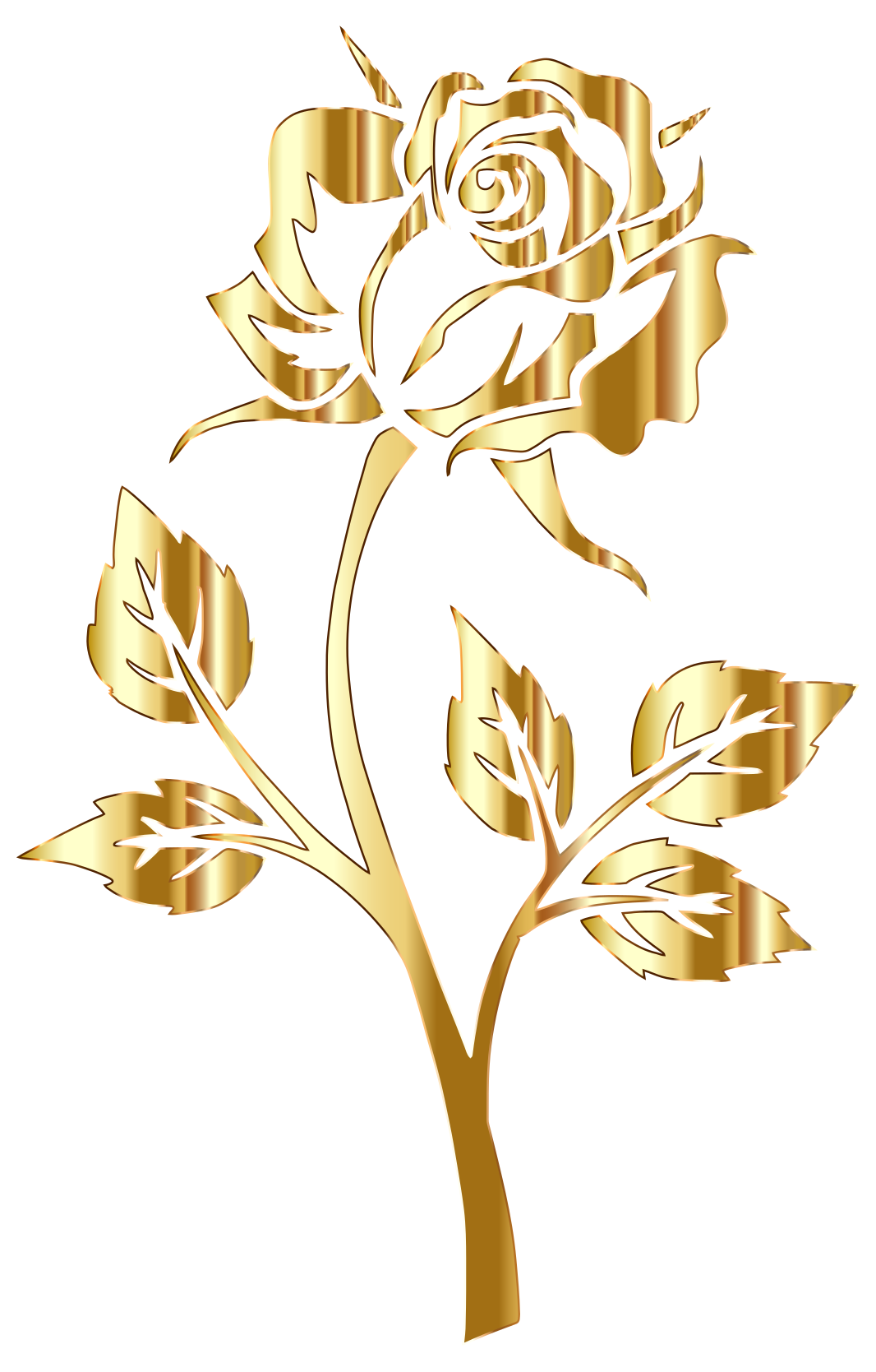 This features a beautifully crafted golden rose with a long stem and five leaves attached to it. The rose is the main focus of the scene, taking up most of the frame. It appears to be a close-up view of the rose, highlighting its intricate details and captivating appearance. The gold color of the rose adds an elegant touch to the overall composition, making it an eye-catching piece of art or decoration.