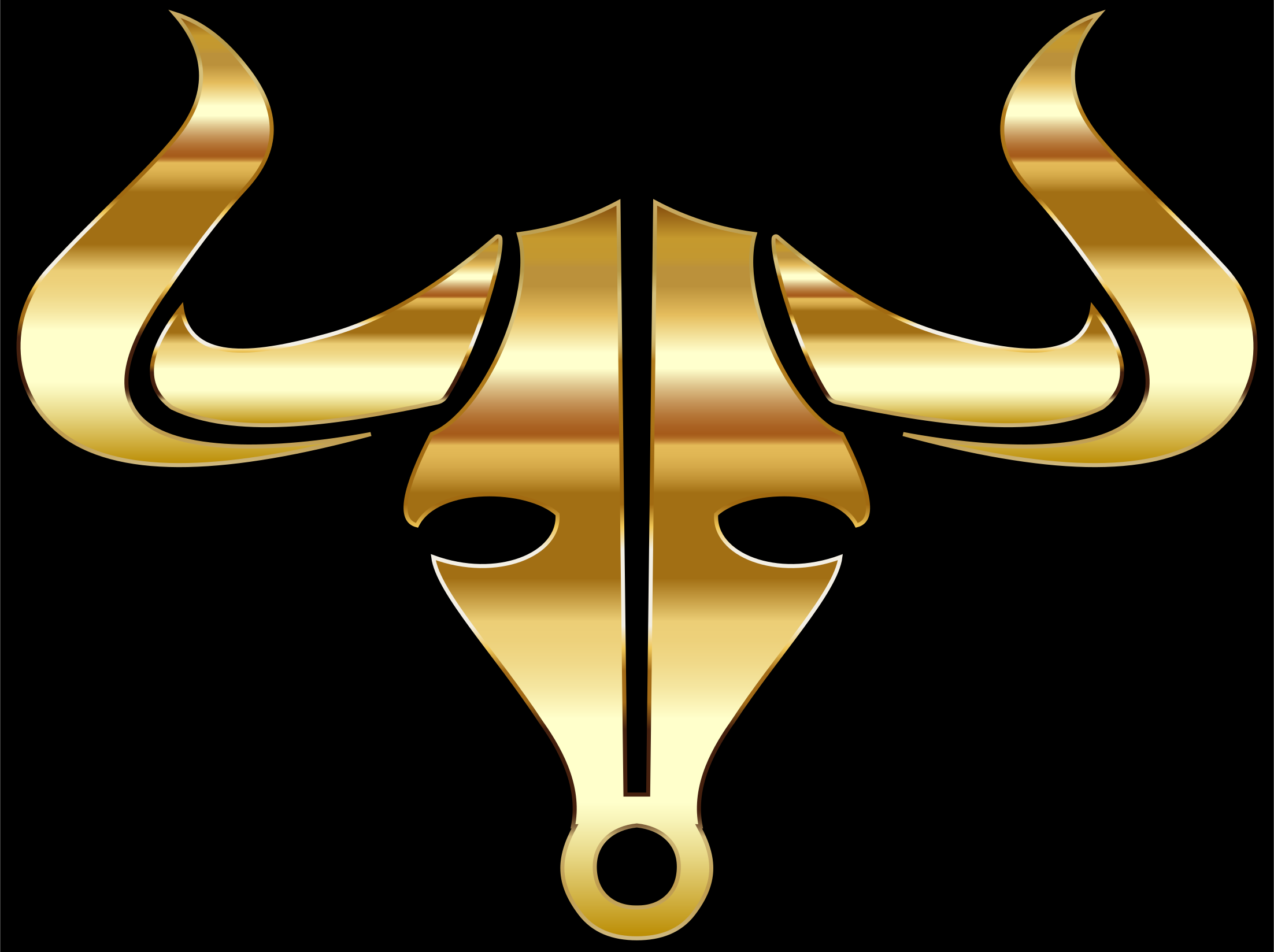 This features a gold and black logo of a bull's head. The bull's head is prominently displayed in the center, with its horns extending outwards. The design appears to be intricate and detailed, showcasing the craftsmanship that went into creating it. The overall appearance gives off an impression of strength and power, which could be associated with a brand or symbol representing these qualities.