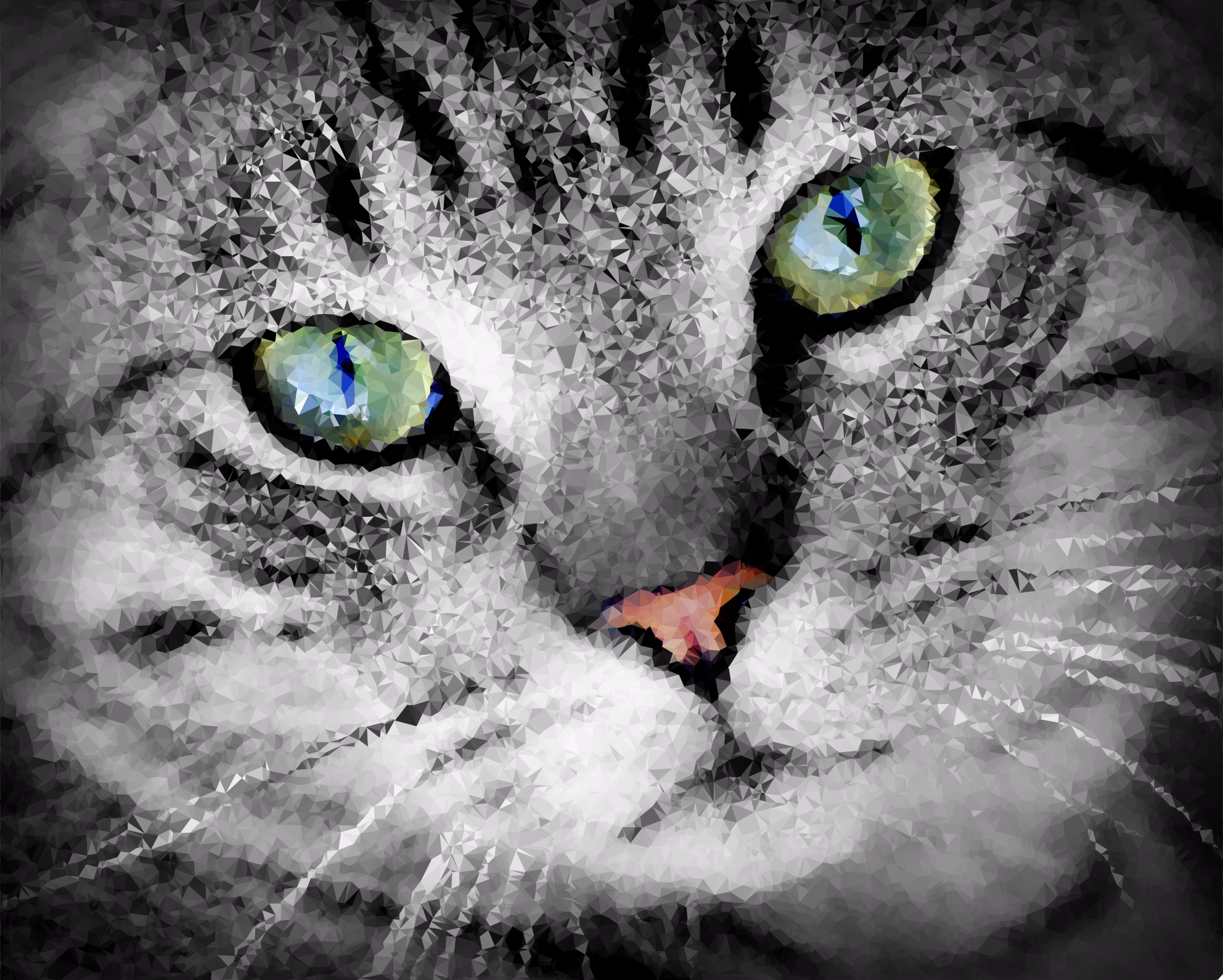 This features a close-up of a gray cat with green eyes. The cat's face is the main focus, and it appears to be looking directly at the camera. Its eyes are brightly colored, adding an interesting element to the photo. The cat has a pink nose, which stands out against its gray fur. Overall, this image captures a unique moment with a close-up of a cute cat's face.