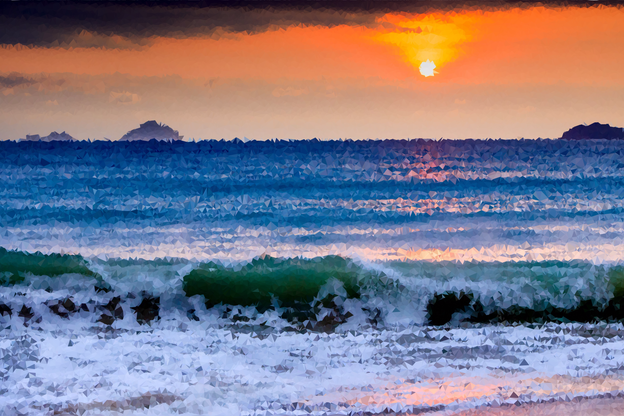 This captures a beautiful sunset over the ocean, with the sun setting behind the horizon. The sky is filled with warm hues of orange and pink, creating a serene atmosphere. In the foreground, there are two small islands visible in the distance, adding to the picturesque scene. The water appears calm and inviting, making it an ideal location for relaxation or leisurely activities.
