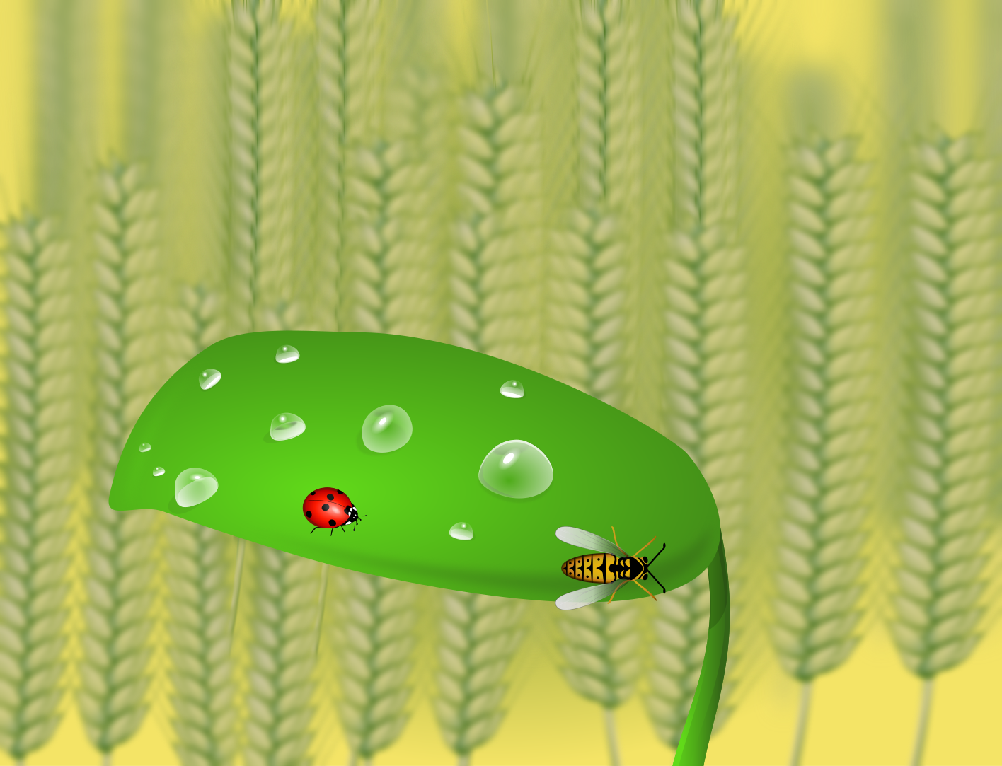 This features a green leaf with water droplets on it, and two insects are present. One of the insects is a red ladybug, while the other is a wasp. They both seem to be enjoying their time on the leaf, which is surrounded by wheat crops in the background. The scene creates an interesting contrast between the natural elements of the leaf and the insects with the man-made element of the water droplets.