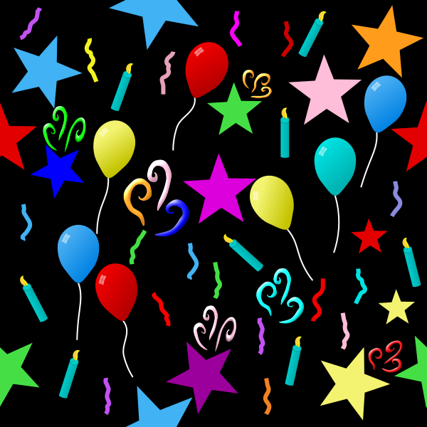 This features a black background with various colorful birthday party icons, including balloons, stars, and candles. There are numerous balloons in different colors of the rainbow scattered throughout the scene, creating a festive atmosphere. Additionally, there are several stars of varying sizes and positions on the background, adding to the celebratory vibe. The combination of these elements creates an eye-catching and lively birthday party display.