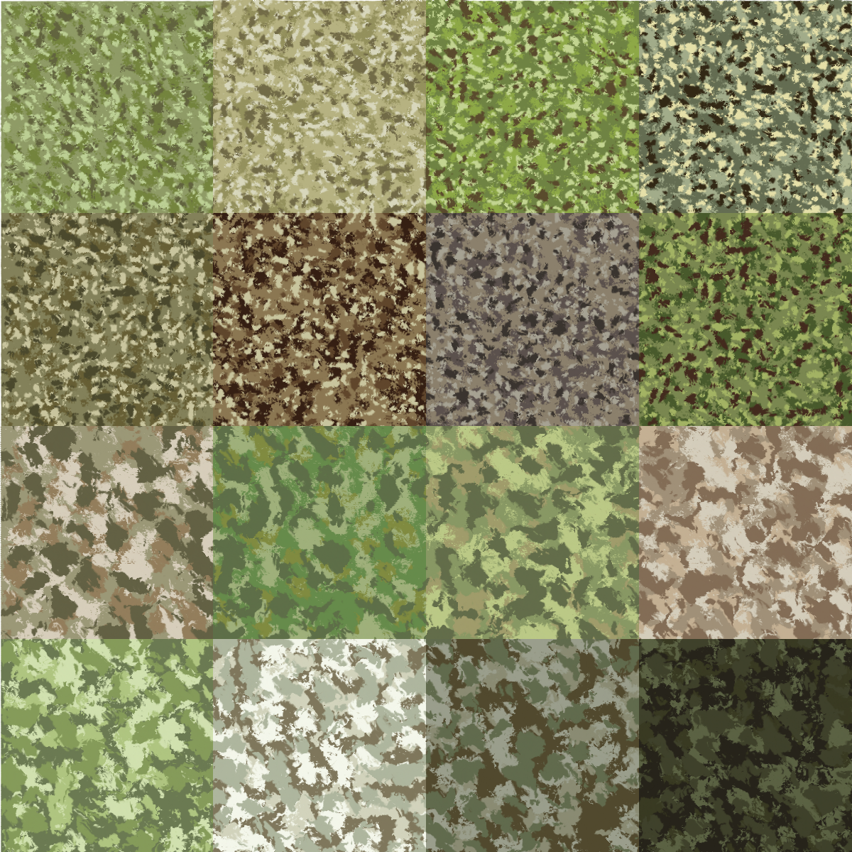 This features a collection of sixteen squares, each with unique camouflage patterns. These squares are arranged in a larger square formation, creating an interesting and visually appealing design. The camouflage patterns vary in color and texture, adding depth and complexity to the overall composition. This artistic arrangement showcases the intricate details of the camouflage patterns while maintaining a cohesive visual theme throughout the entire image.