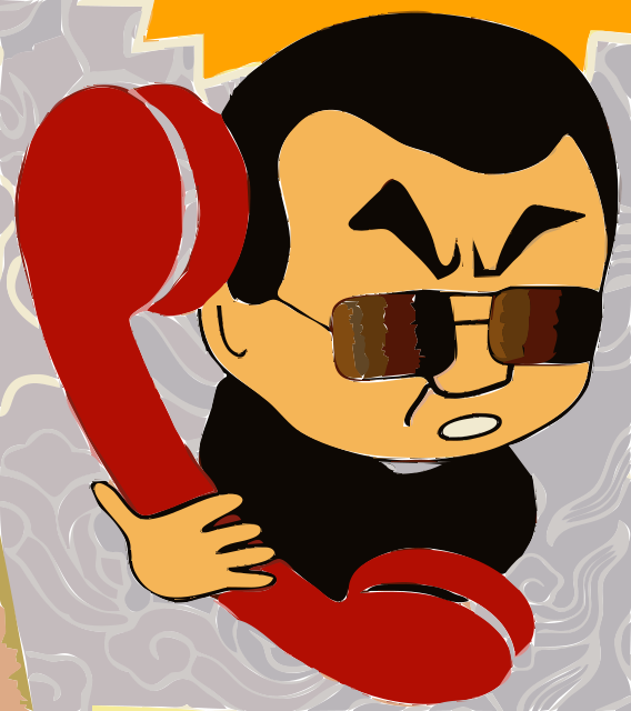 This features a cartoon character with sunglasses and a mustache, holding a red telephone to his ear. He appears to be making an angry face while talking on the phone. The cartoon is drawn in black and white, giving it a classic feel. The character's facial expression suggests that he might be having a disagreement or dealing with a difficult situation over the phone.
