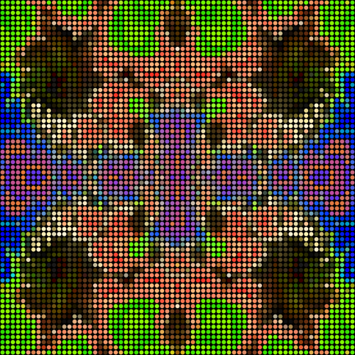 This is a colorful and intricate design made up of many small dots. It appears to be a close-up view of the pattern, showcasing its detailed structure. The dots are arranged in various shapes and sizes, creating an interesting visual effect. The colors used in this design are vibrant and varied, making it stand out as a unique piece of art or decoration. Overall, the image presents a captivating and eye-catching pattern that is both visually appealing and thought-provoking.