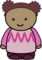 This features a cartoon character, specifically a brown-skinned girl with curly hair and big eyes. She is wearing a pink shirt and purple pants, giving her a cheerful appearance. Her smile adds to the overall warmth of the scene. The girl appears to be standing in front of a white background, which provides a clean and uncluttered backdrop for the image.