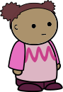 This features a cartoon character, specifically a girl with brown hair and a pink shirt. She is wearing red shoes and has a pink wavy line design on her shirt. Her expression appears to be somewhat puzzled or curious as she looks off into the distance. The overall scene gives an impression of a playful and whimsical atmosphere, with the girl being the central focus of attention.