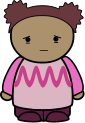 This features a cartoon drawing of a little girl wearing a pink shirt and purple leggings. She has brown hair, and her eyes are closed as if she is sad or sleepy. The girl appears to be standing in front of a white background, which adds emphasis to the contrast between her and the background. This drawing captures a moment of introspection for the young character, evoking feelings of sympathy from the viewer.