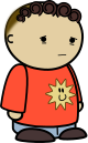 This features a cartoon character wearing a red shirt with a yellow sun on it. The character appears to be sad, as they are frowning and looking downward. They are standing in front of a white background, which provides a clean and simple backdrop for the scene. The overall appearance of the character is quite cute and endearing, making them an appealing subject for viewers.