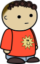 This features a cartoon character, possibly a boy or a young man, wearing an orange shirt with a sun on it. He is standing in front of a white background and appears to be looking at something off-camera. The character's facial expression suggests that he might be curious or intrigued by the object or situation he is observing. The cartoon style adds a playful and lighthearted atmosphere to the scene, making it suitable for various applications such as children's books, animated films, or advertisements.