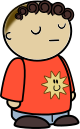 This features a cartoon character wearing an orange shirt with a sun on it. The character is standing in front of a white background, giving the impression that they are posing for a picture. The cartoon character appears to be smiling and has a somewhat surprised expression on their face. This whimsical design could be used for various purposes such as advertising or entertainment.