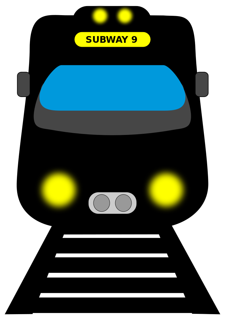 This features a black and yellow train with the words "Subway 9" written on top of it. This train is designed to transport passengers, providing them with a convenient means of traveling within the city. The vibrant colors of the train make it easily recognizable and distinguishable from other modes of public transportation. The design of the train also includes yellow lights that illuminate the front, adding an additional layer of safety for both passengers and pedestrians in the area. Overall, this image showcases a modern and efficient mode of urban transportation.