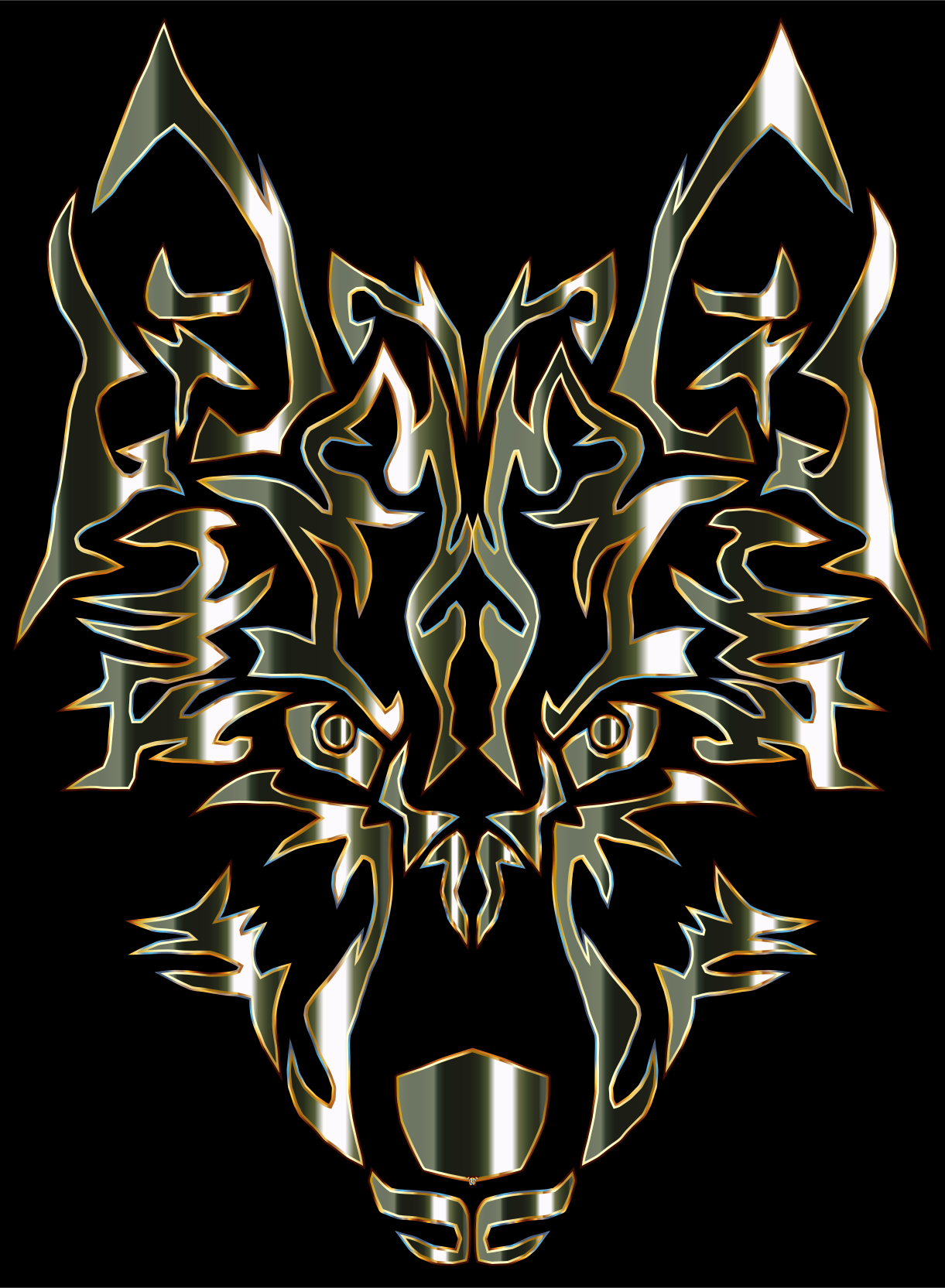 This features a close-up of a wolf's head, with its mouth open and teeth visible. The wolf appears to be wearing a gold necklace around its neck. The design is intricate and detailed, showcasing the wolf's facial features in an artistic manner. The overall effect gives off a sense of power and strength, as if the wolf were a warrior or protector.
