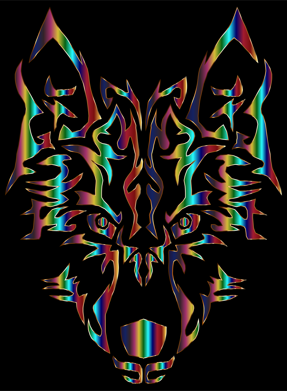 This features a shiny wolf head with pointy ears. The wolf's head is adorned with prismatic colors, giving it an angry appearance. The wolf's mouth appears to be open, possibly showing its teeth or growling at the viewer. The overall effect of the image is that of a vibrant and colorful representation of a wolf's head.
