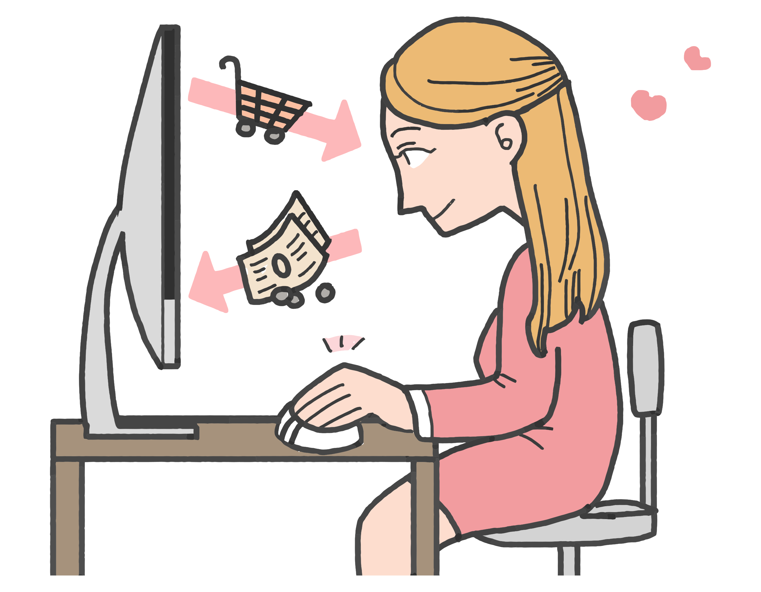 This features a woman sitting at her computer desk, working on the laptop. She is wearing a pink dress and appears to be focused on her task. There are several objects around her, including a mouse near the bottom of the screen, a keyboard in front of her, and two hearts located above her head. Additionally, there is a TV visible in the background, and a chair can be seen behind the woman. The scene suggests that she might be browsing online or engaging in some form of digital activity.