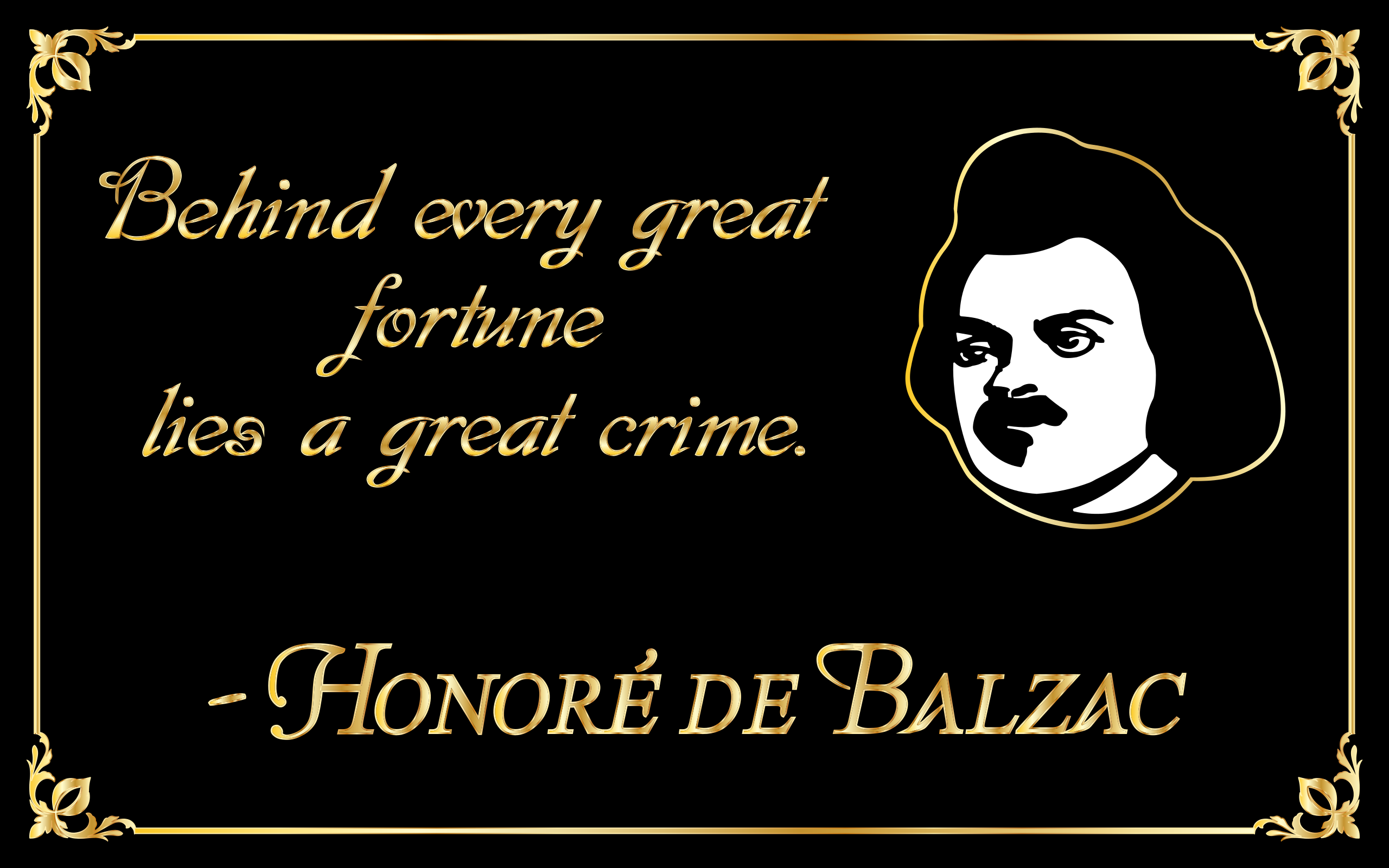This features a quote from Honoré de Balzac, a French novelist and playwright. The quote is displayed in gold lettering on a black background with a picture of the author's face in the top right corner. The quote reads "Behind every great fortune lies a great crime." This statement suggests that wealth and success often come at a cost to others, which is a theme commonly explored in Balzac's works.