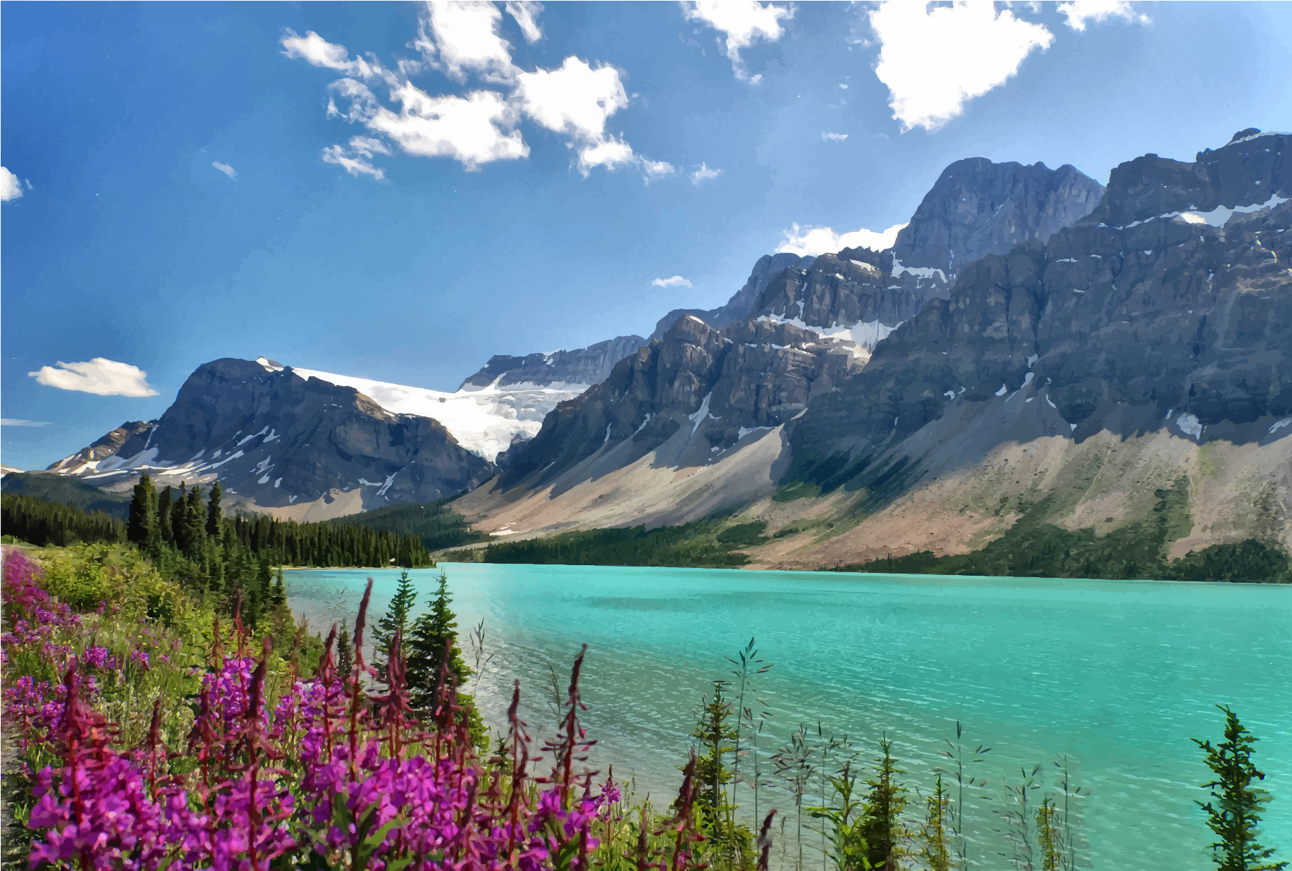 This showcases a beautiful scene of mountains in Canada, with a large body of water that appears to be a lake. The water is light aqua and the surrounding area features a lush green landscape. In front of this picturesque view, there are purple flowers that add a vibrant touch to the scenery. A few people can also be seen in the image, likely enjoying the serene surroundings or engaging in outdoor activities such as kayaking on the lake. The combination of mountains, water, and colorful flowers creates an idyllic atmosphere that is sure to captivate viewers.