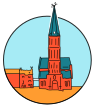 This is a round picture of an old church with a steeple. It appears to be a drawing or painting, possibly in the style of a children's book illustration. The church has a tall tower and a cross on top, making it stand out as a prominent feature in the scene. In addition to the church, there is another building located next to it, which adds depth and interest to the composition. Overall, the image captures the beauty of an old church with its distinctive architecture and surroundings.