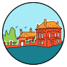 This features a round, colorful picture of two houses with orange roofs and yellow chimneys. One house is located on the left side of the scene, while the other is situated more towards the center. In the background, there are three birds flying in the sky, adding to the lively atmosphere of the scene. The overall composition creates a sense of harmony between nature and architecture, as well as an inviting and warm ambiance for those who visit or live in these homes.
