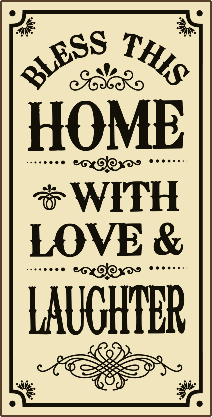 This features a sign with the message "bless this home with love & laughter" written on it in black. The sign is adorned with several floral designs and borders, adding an elegant touch to its appearance. The combination of the message and decorative elements creates a warm and welcoming atmosphere for anyone who sees or reads the sign.