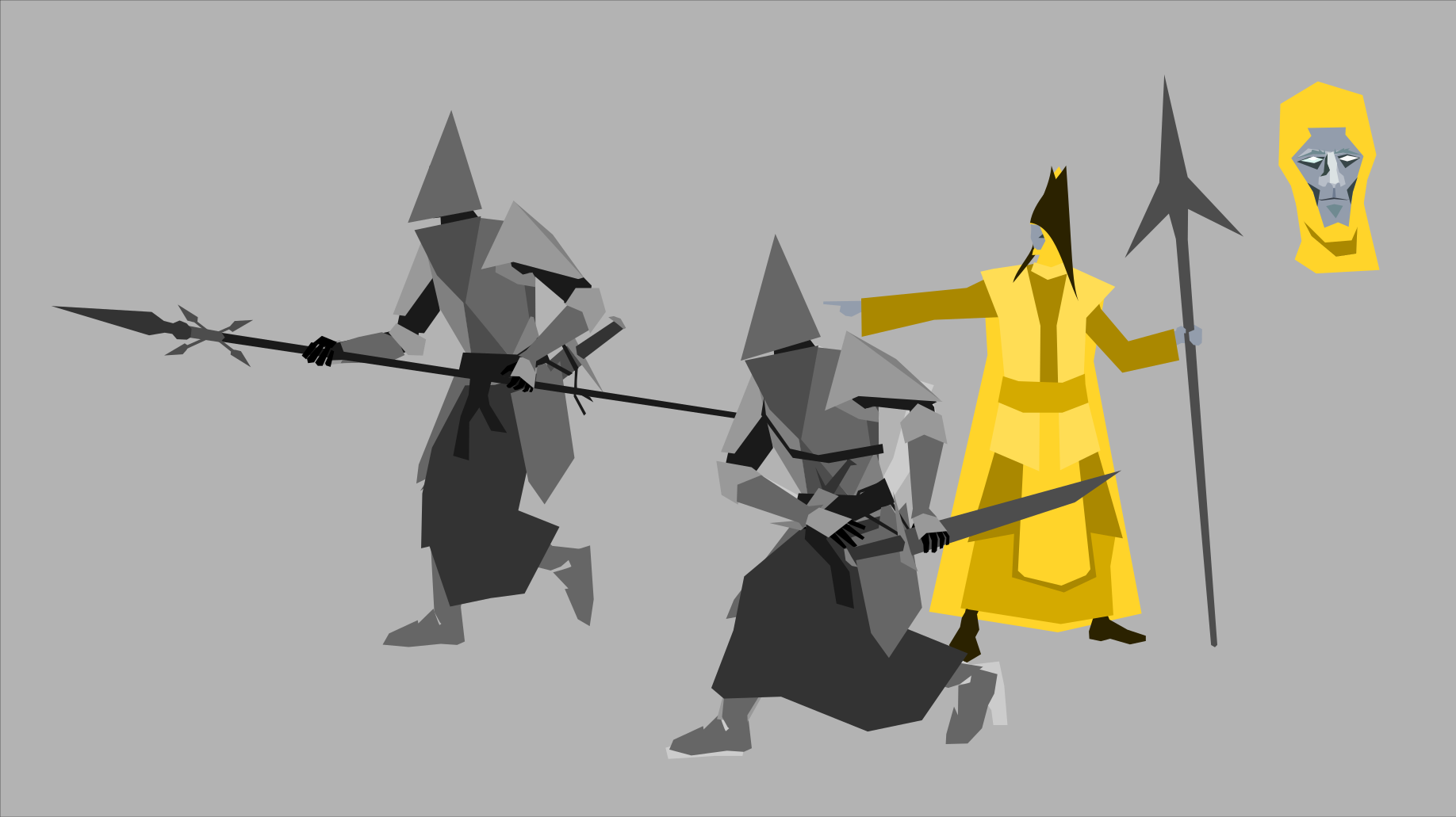 This features a group of three people, with one person in the center holding a yellow staff and another person on their left side. They appear to be walking together or possibly fighting against each other. There is also a third person standing further back, closer to the right edge of the image. The first person in the scene has a sword in hand, while the second person appears to have a shield. The third person seems to be unarmed but still part of the group. The overall atmosphere suggests an adventure or battle taking place between these individuals.