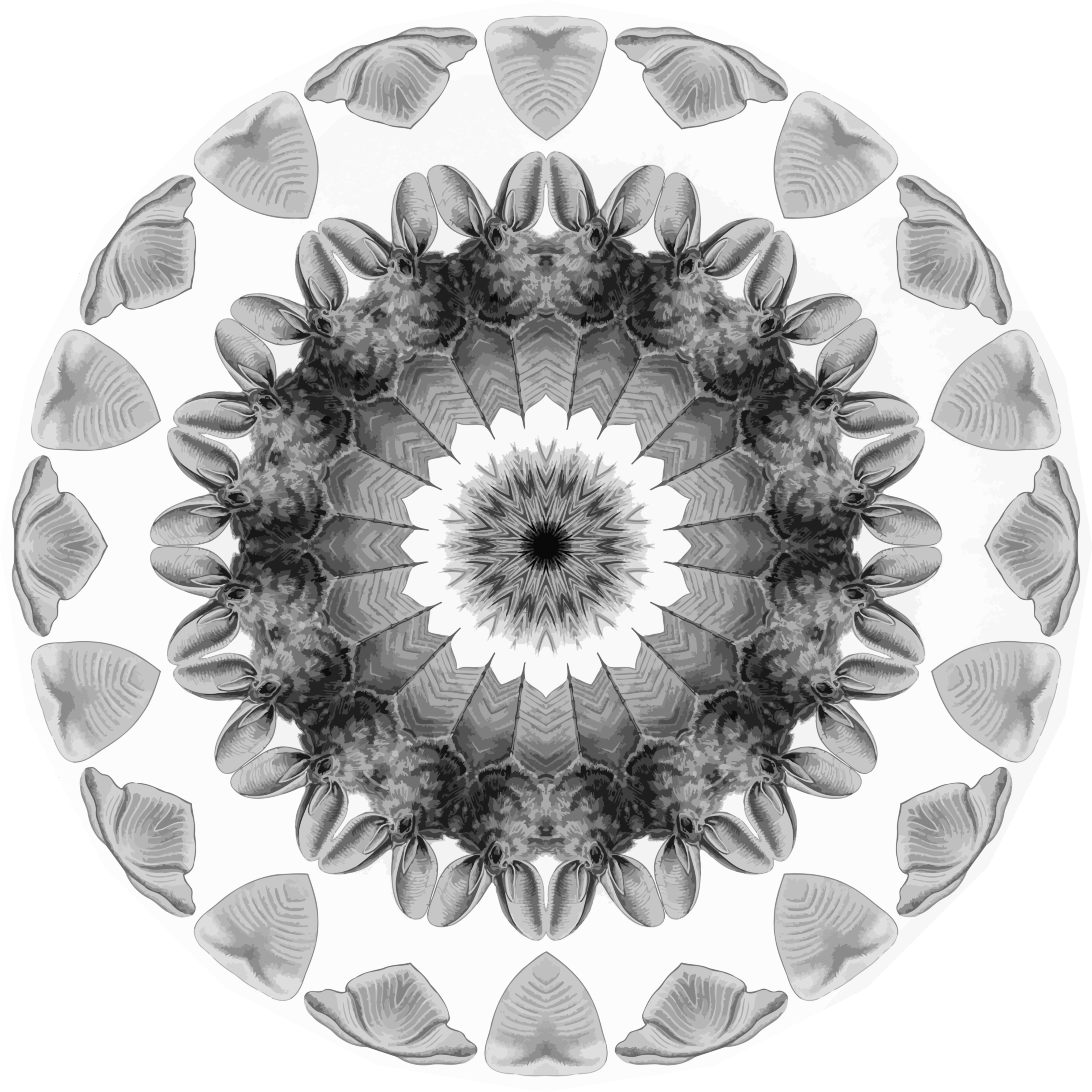 This features a circular design with an intricate pattern, likely inspired by Ernst Haeckel's artwork. The design is created using a combination of bats and shells arranged in a visually appealing manner. The center of the circle has a large black dot that serves as the focal point for the entire composition. This unique design showcases an interesting blend of organic shapes, such as bats and shells, which are skillfully combined to create a captivating visual effect.