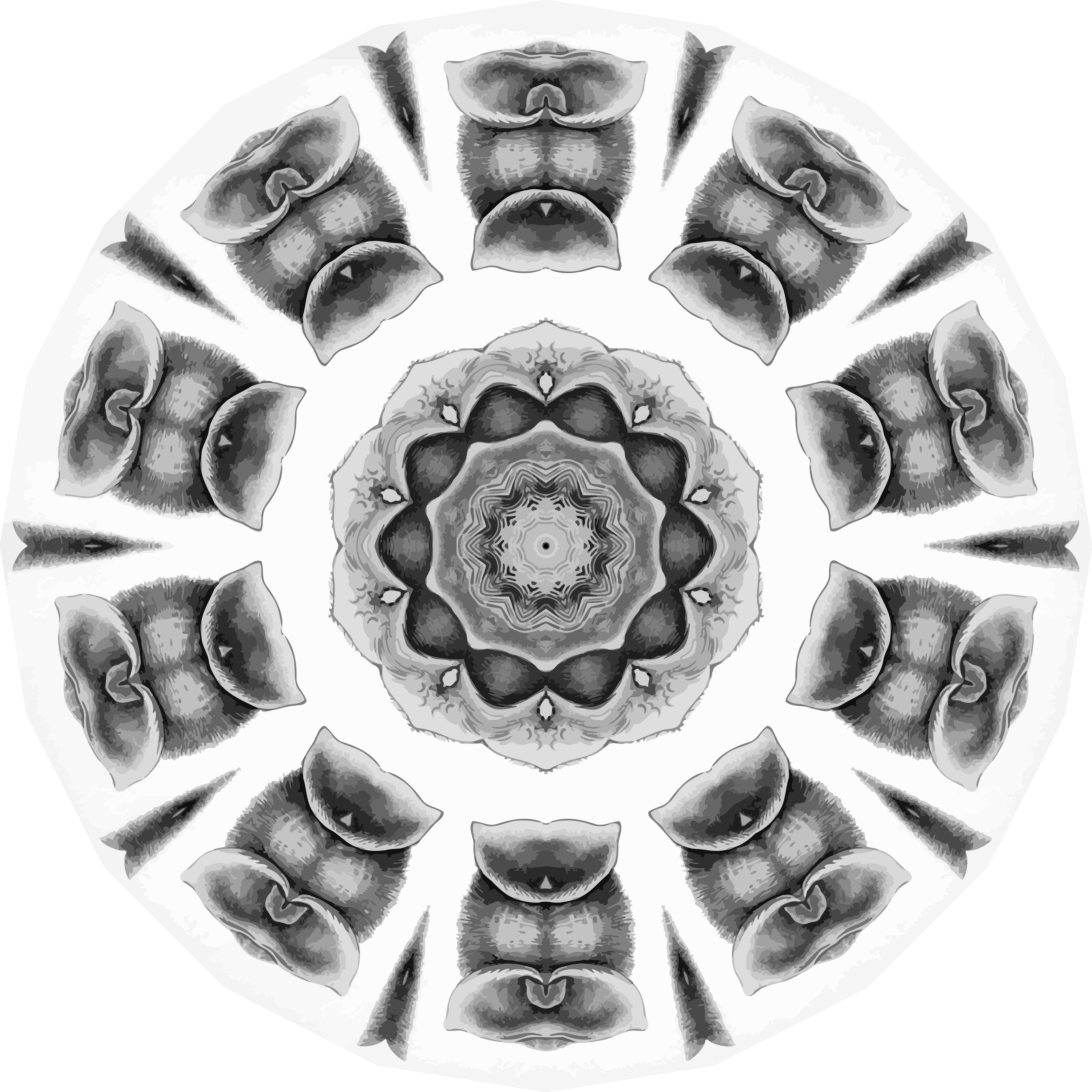 This features a circular design with an intricate pattern, resembling a flower or a series of connected circles. This artistic piece is created using a combination of shapes and lines that are arranged in a visually appealing manner. The design appears to be inspired by Ernst Haeckel's drawing of bats, which has been transformed into an eye-catching pattern through the use of repeated rotations around a central point. This unique artwork is presented as a PNG image and was vectorized using Vector Magic, resulting in a clean and crisp appearance.