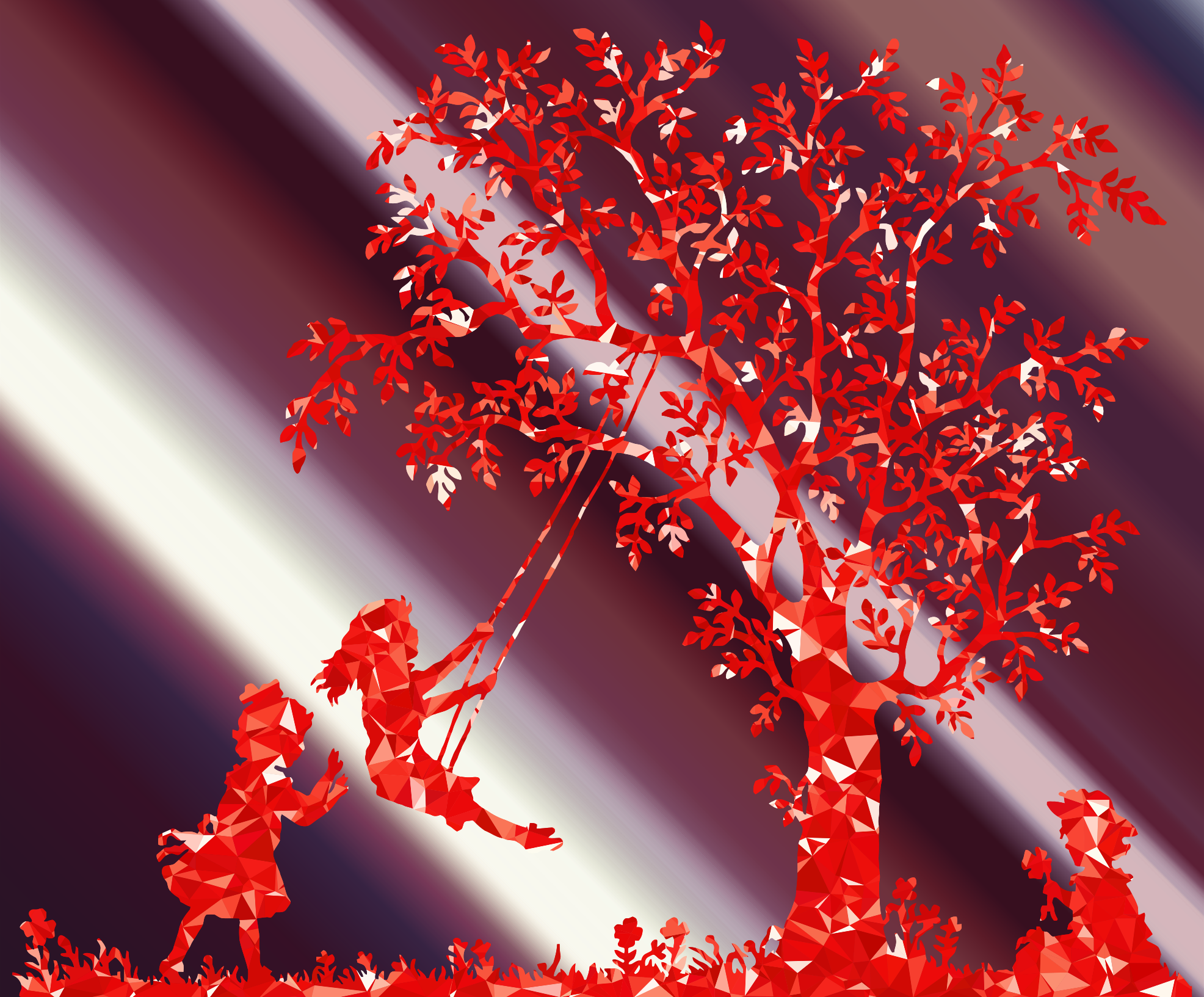 This features a red tree with a swing attached to it, surrounded by a field. There are three people in the scene: one person is sitting on the swing, another person is standing next to them, and the third person is further away from the swing. They all appear to be enjoying their time together under the tree. The vibrant red color of the tree adds a lively atmosphere to the scene.