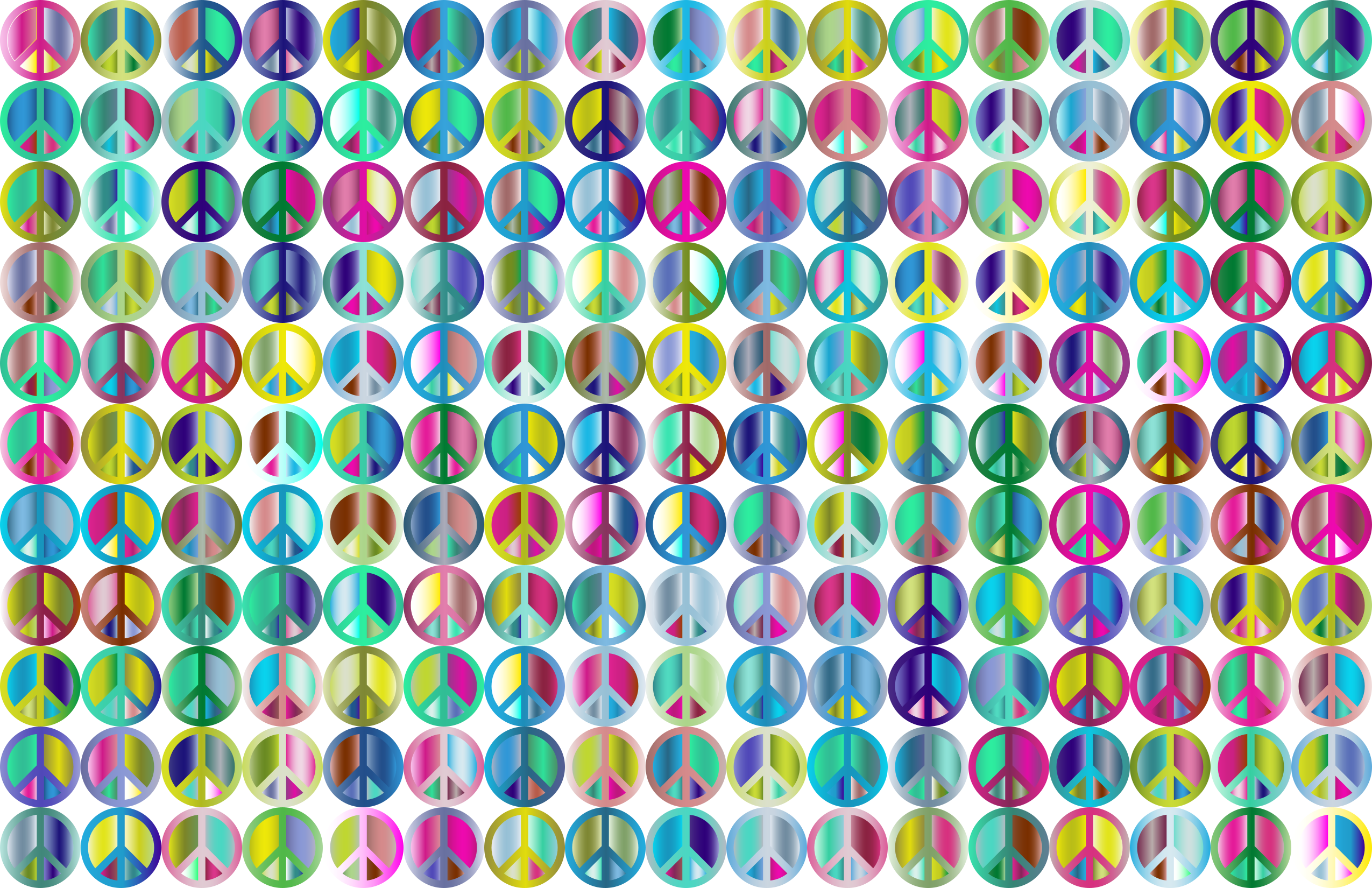 This features a large, colorful pattern of peace signs arranged in various shapes and sizes. There are at least 13 different colors visible in the design, creating an eye-catching and vibrant display. The peace signs can be seen in multiple orientations throughout the scene, with some placed horizontally, vertically, or diagonally. This unique pattern showcases a creative and artistic approach to incorporating the iconic symbol of peace into a visually appealing design.