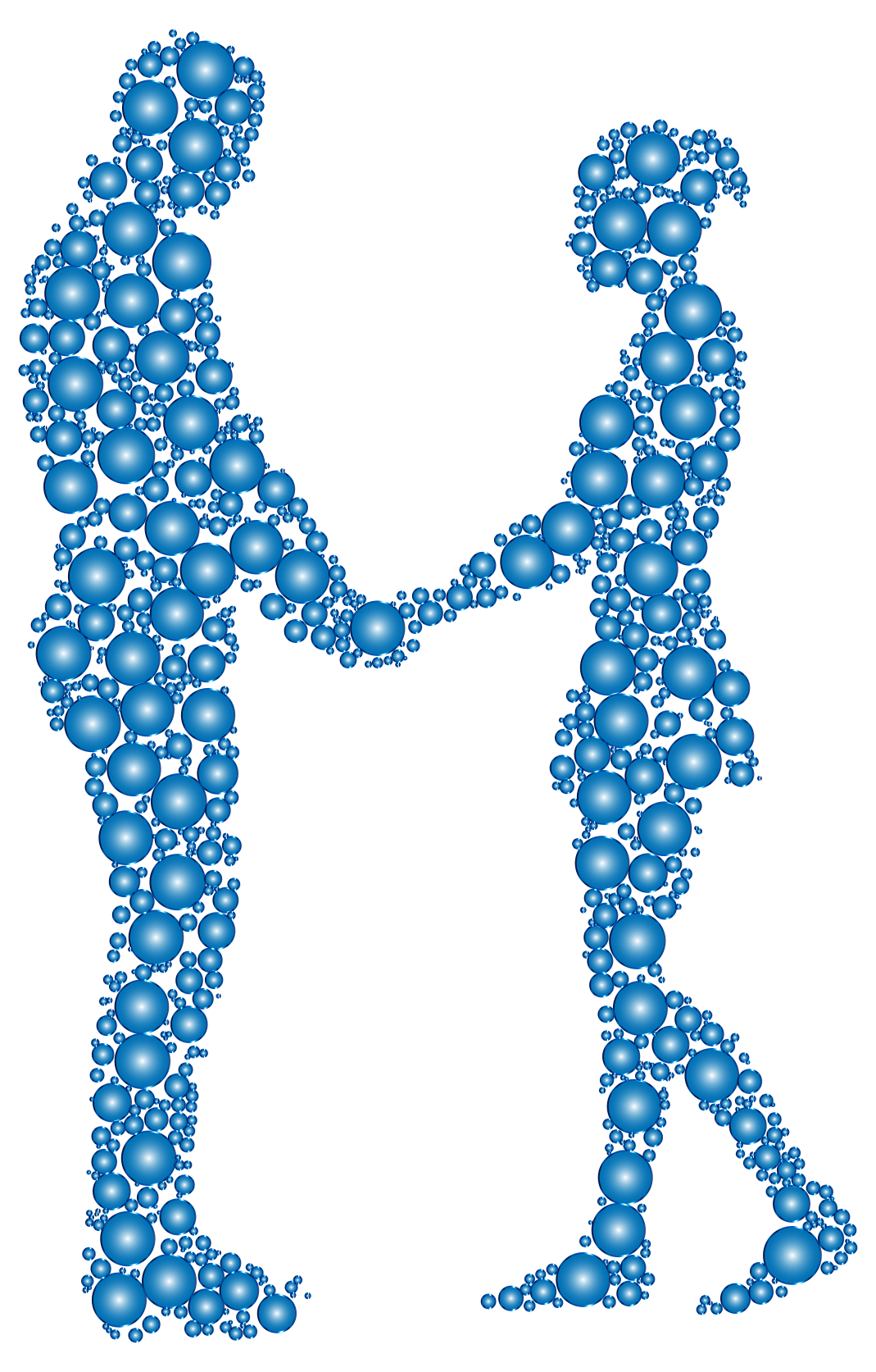 This features a man and woman standing next to each other, both with their arms outstretched. They are surrounded by numerous blue spheres of varying sizes that fill the background. These blue spheres create an interesting visual effect, giving the impression of a hug between the two figures. The scene is reminiscent of a painting or a graphic design, where the man and woman are the main focus while the blue spheres serve as a unique backdrop.