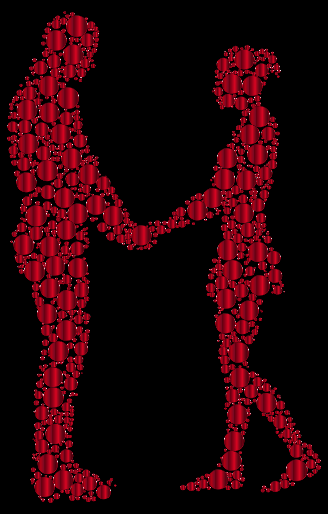 This features a man and woman standing next to each other, both wearing red clothing. They are positioned in such a way that they appear to be shaking hands or greeting one another. The scene is set against a black background, which contrasts with the bright red color of their outfits. The image also contains several smaller figures scattered throughout the frame, possibly representing additional people or elements within the scene.