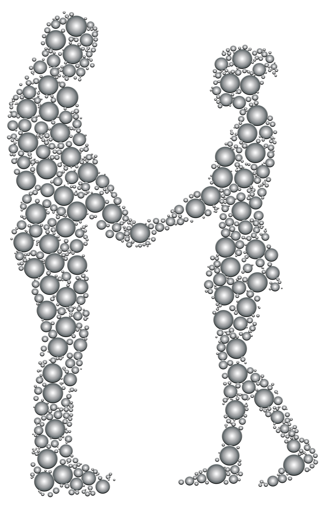 This features a unique and artistic representation of two people standing next to each other. Instead of being actual human figures, the individuals are made up of various small circles or beads that form their bodies. This creative depiction gives an impression of a hug between the two figures, with one person's body composed of more circles than the other. The arrangement of these circles creates a visually striking and intriguing scene, showcasing the artist's skill in using simple shapes to convey complex emotions or ideas.